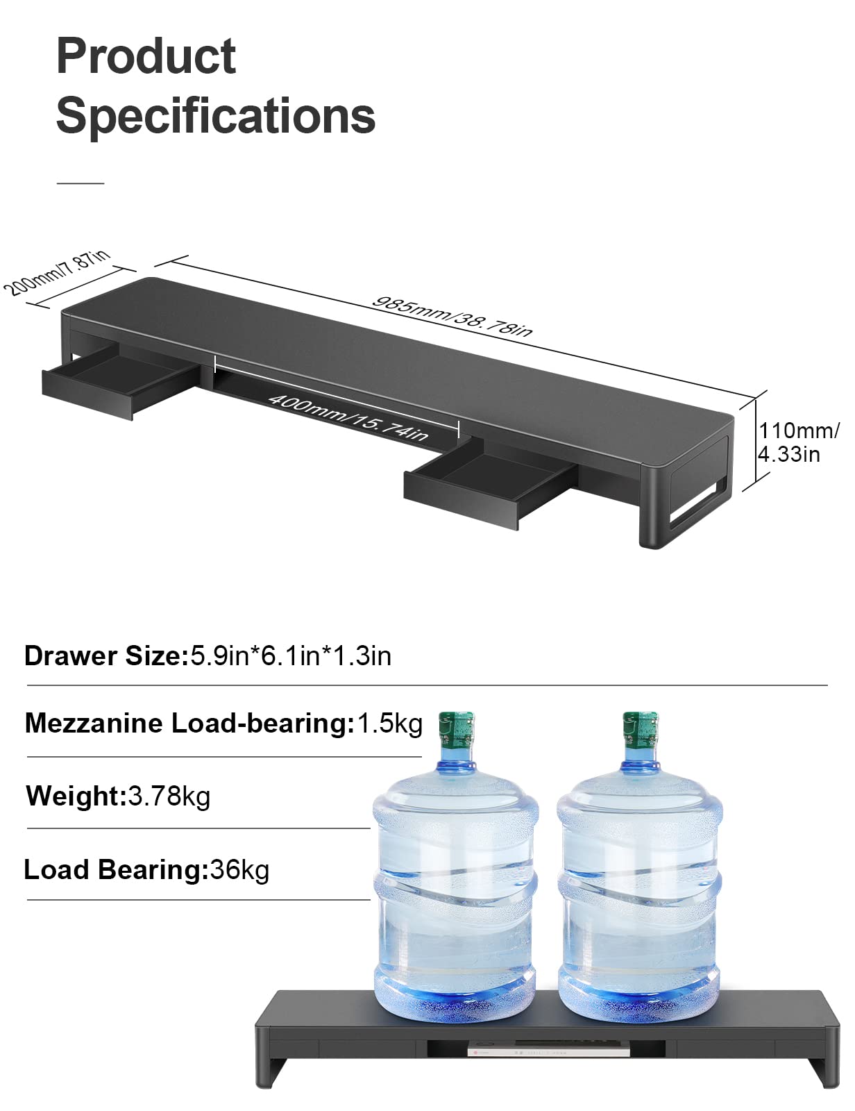 - Ergonomic Design: Our Extra-Long Monitor Stand with Drawer is based on the concept of health and is designed to raise your monitor to a scientific and suitable height, releasing the pressure on your neck and waist. Its powerful desktop storage capacity will help you save more space and practically improve your office comfort.