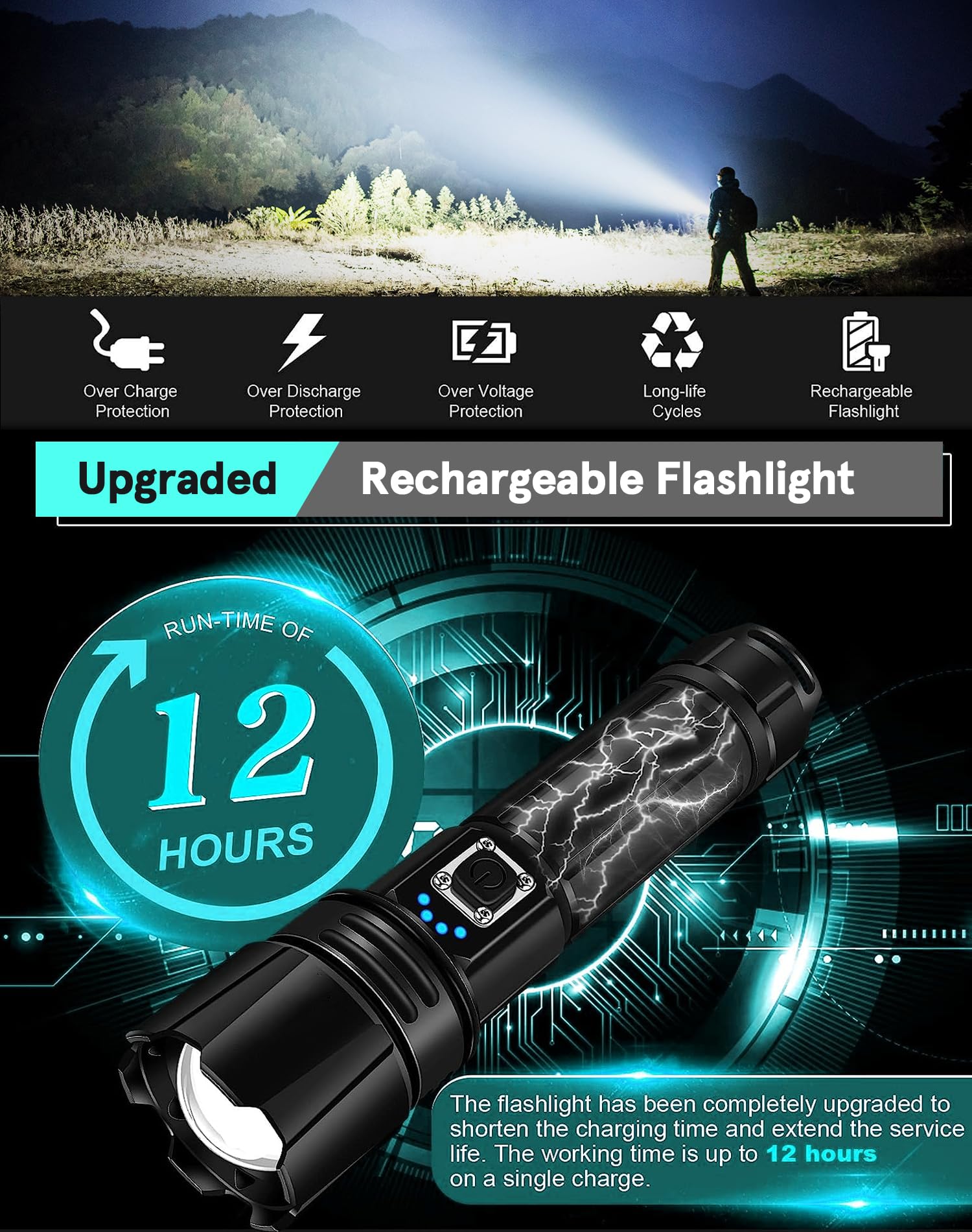 LED Torch Rechargeable Flashlight with High Lumens, 20000 Lumens Super Bright Torch, XHP70.2 High Powered Torches, Long Lasting, Waterproof, Zoomable, for Gift Camping Hiking Emergency