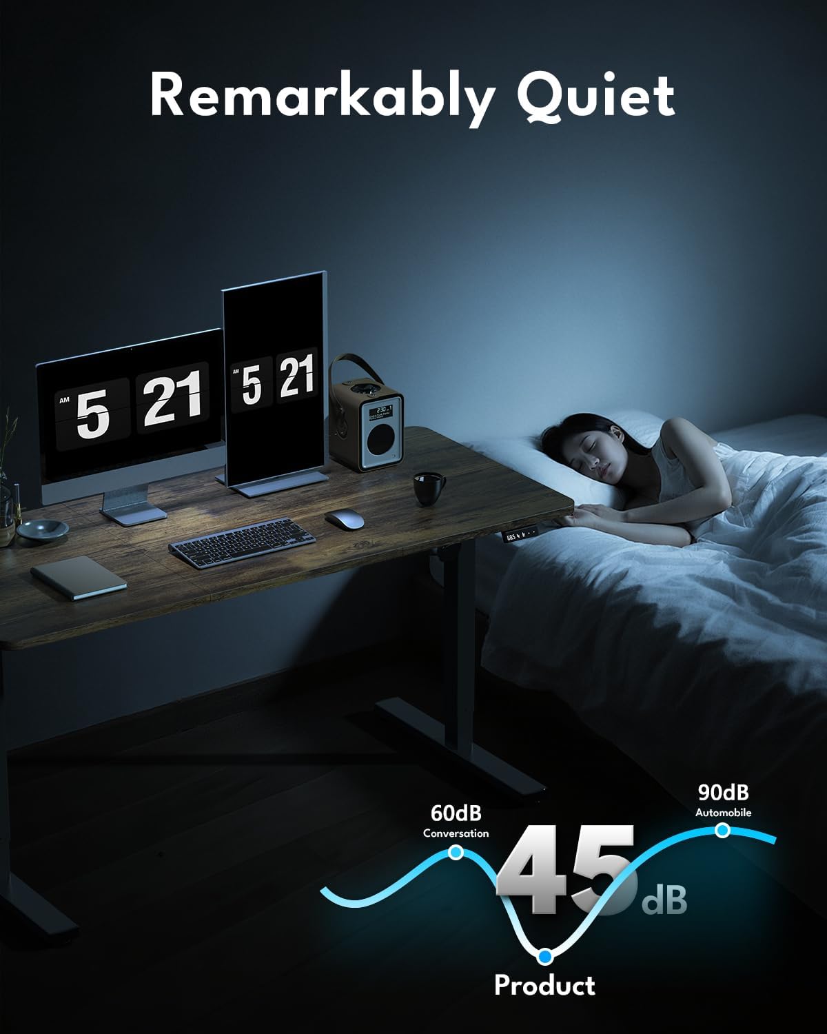 - Outstanding Stability: The sit-stand desk features a robust construction, employing premium-quality steel materials and an industrial-grade steel frame. This design ensures outstanding stability during daily use, along with smooth and dependable performance when adjusting the table's height. The desk has a durable, quiet motor tested over 100,000 lift-and-lower cycles, ensuring stable and quiet operation, and supports up to 80 kg.