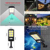 - 120 COB Ultra-bright: 120 COB outdoor solar lights can produce ultra-high brightness lighting in a wide area, for front doors, paths, gutters, porches, front/back yards, gardens, driveways, fences, walls, stairs, landscapes, terraces or any Outdoor places that need lighting provide a lighting experience, bringing you a super bright lighting experience.