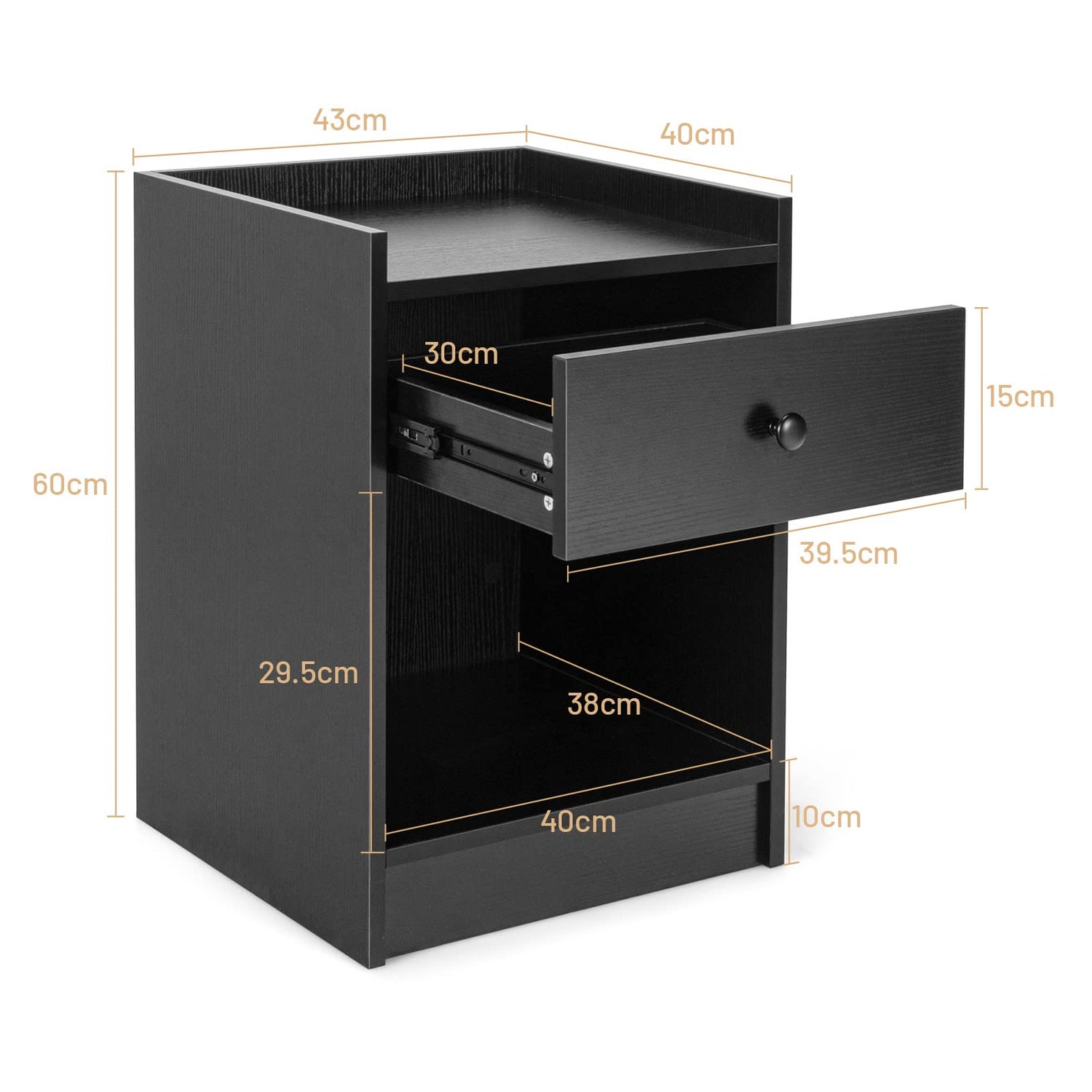 Our nightstand set is a perfection of style and practical value, and will add a modern touch to your room. Each nightstand has a spacious top, a sliding drawer and an open compartment for storage, aiming to keep your room tidy and clean and bring unparalleled convenience to your life. You can keep your essentials within your reach when you couch in the bed or sofa. What's more, this wooden furniture is also stable and durable to stay by your side for a long time. And it also has bottom pads to avoid scratching the floor. So you can use it in any room with confidence.