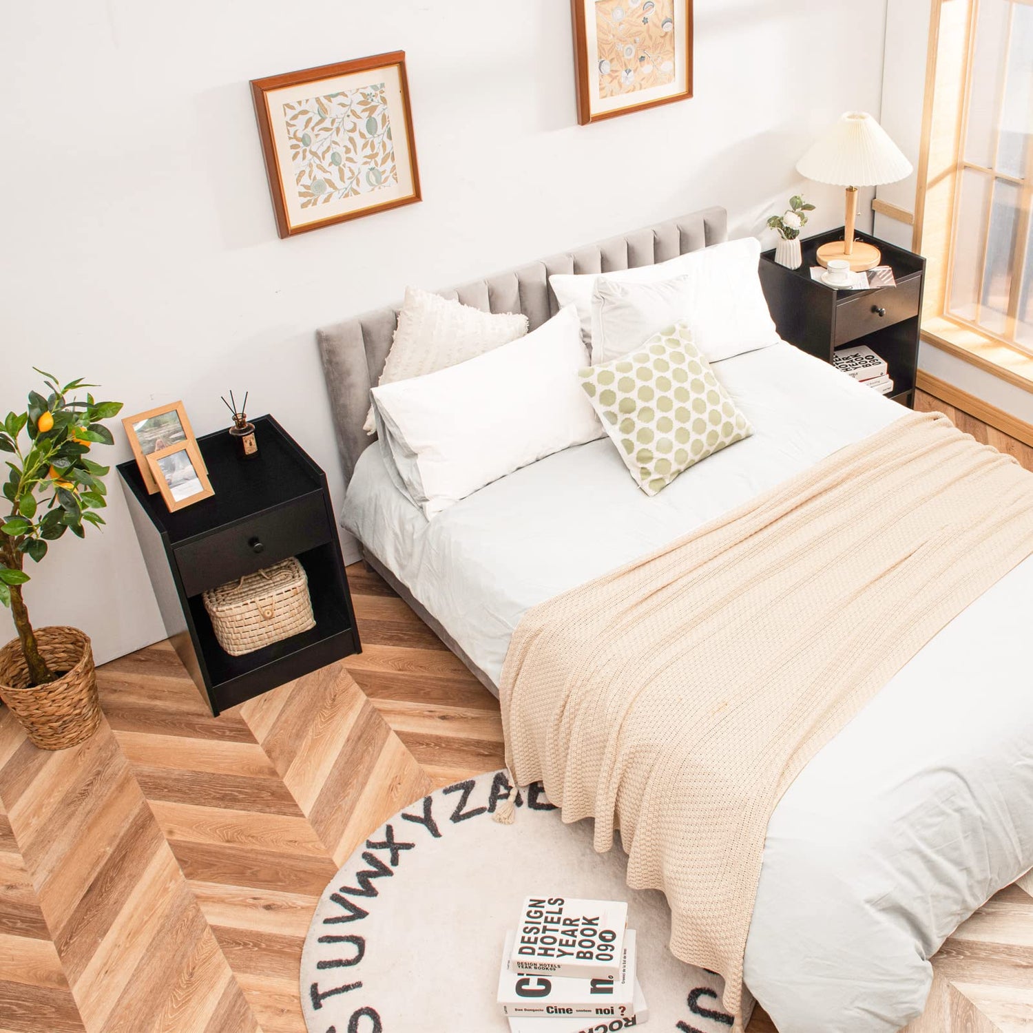 - Keep Essentials at Your Hand: The nightstand has a top with raised edges, on which you can properly put your glasses, phones, books or cups and enjoy a sound sleep. And the capacious space can still accommodate lamps, photograph frames and other things to display, bringing convenience to your life.