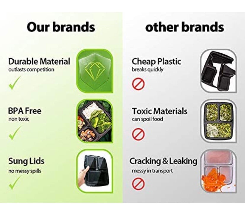 1 x 3 Compartment (10 Pack) Premium BPA Free Reusable Meal Prep Containers
