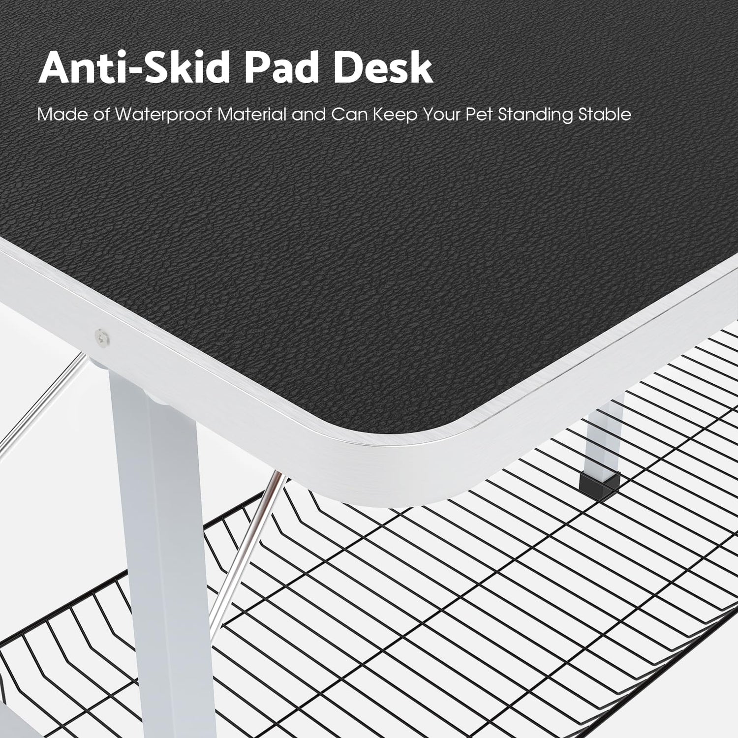- Easy to clean: The foldable dog grooming table surface is a waterproof material, it’s convenient for cleaning the table after the dog is groomed. And non-slip texture that keeps your pet standing stable. High-quality legs come with anti-slip rubber to add stability
