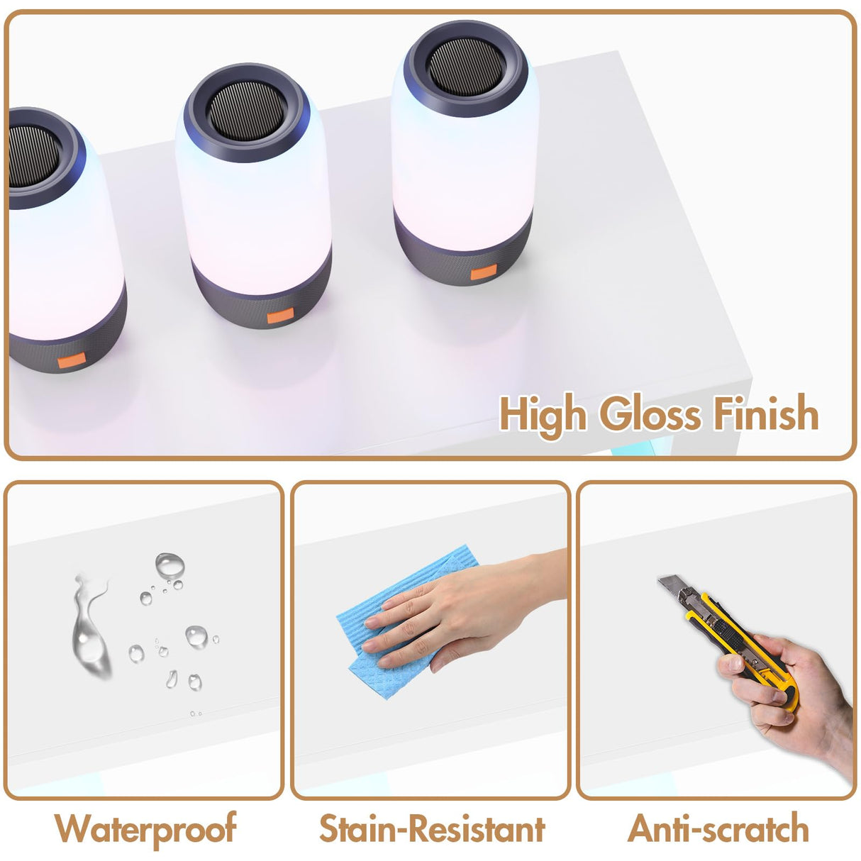 - Stable and High-Quality: The combination of particle board and tempered glass ensures that the TV stand is strong and durable, the high-gloss finish makes the surface easy to clean, resisting stains and scratches, ensuring the furniture looks pristine for longer.