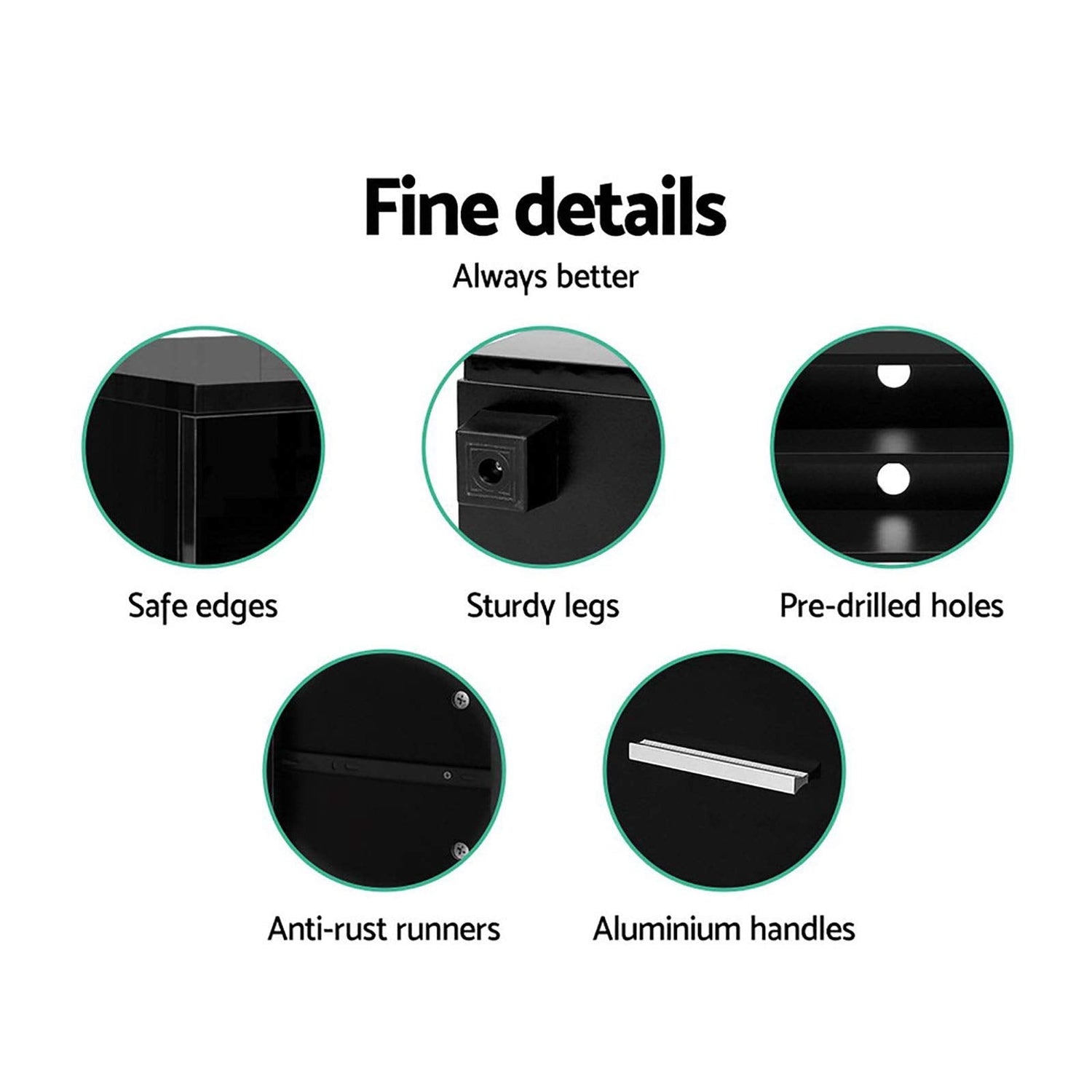 Need a stylish and modern entertainment unit for your home? Look no further than our Artiss Entertainment Unit which is absolutely stunning in every aspect. Made of particle board, the entertainment unit is sturdy and durable with equally fine hardware to ensure trouble-free use every time. The UV high gloss finish is flawless and smooth to the touch. The unit will be the perfect addition for your modern living room with its contemporary and linear design. And it offers ample storage space with two open shelves, and two drawers for all your entertainment essentials. Plus, the drawers feature aluminium handles that add a stylish accent to its black hues. Not least, the pre-drilled holes at the back allow for neat and tidy management of all cabling connections.