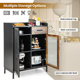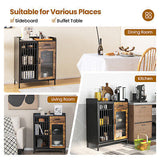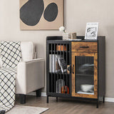 A perfect choice for home storage! The sideboard features wide cabinet top to accommodate various household appliances. Multiple compartments inside the cabinet help to classify necessities, which can satisfy your desire in different occasions. Considering higher stability and security, the kitchen storage cabinet is designed with anti-toppling device, so that you can fix the sideboard to the wall to prevent wobbling. Sturdy metal legs also provide reliable support. It is designed in rustic and vintage style to increase aesthetics to your home, restaurant and pub. The combination of metal mesh door and tempered glass door takes the practicality and aesthetics to higher level.