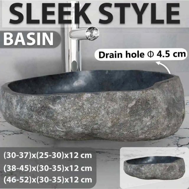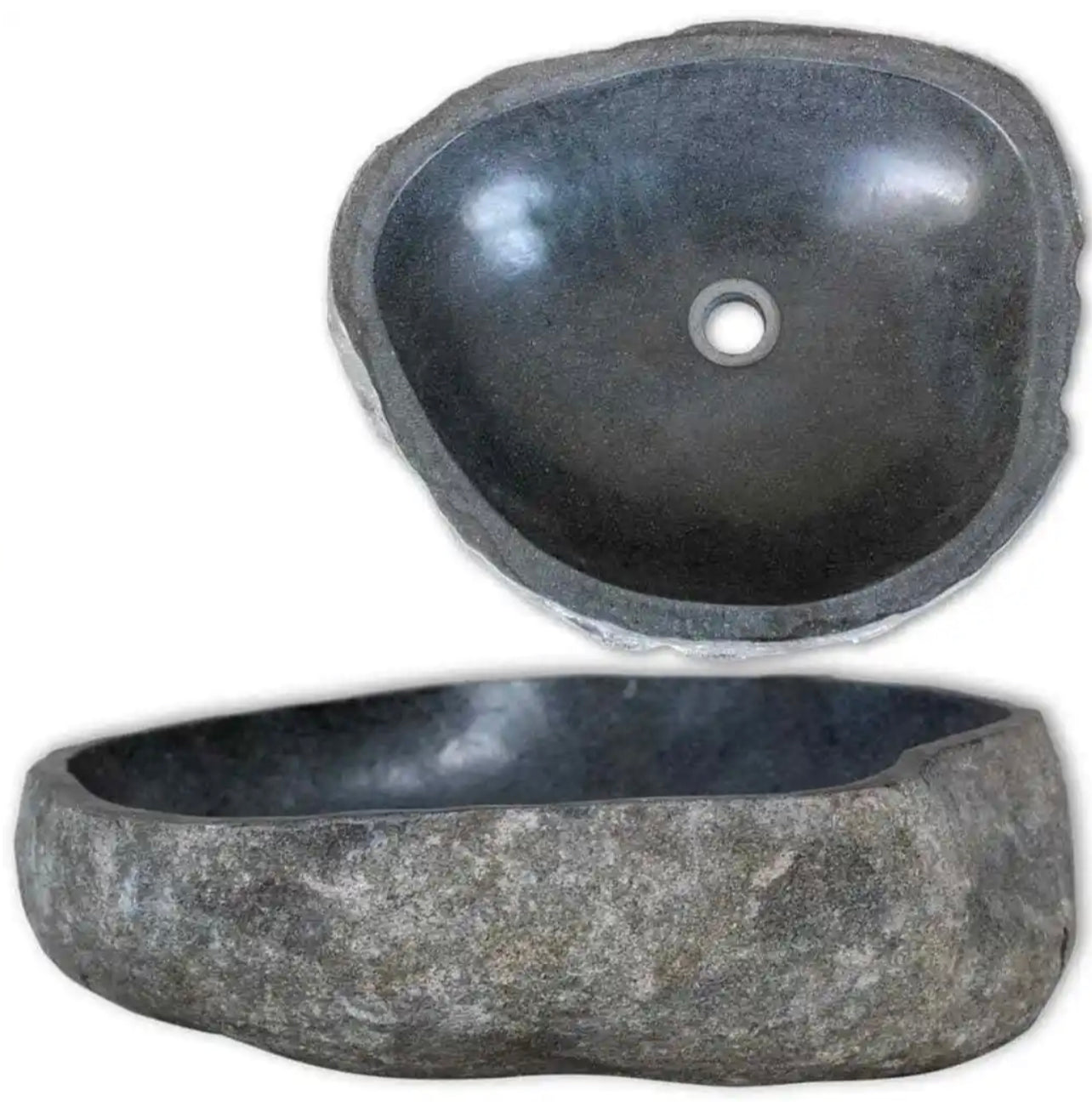 This oval-shaped wash basin, made of natural river stone, will make a stylish addition to any bathroom or washroom.