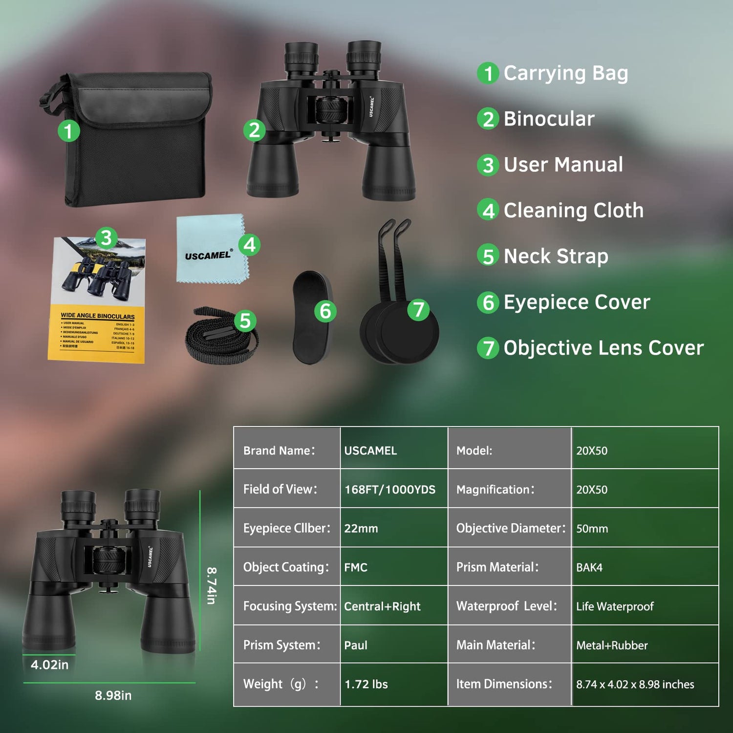 - High-Powered Porro Prism Binoculars: These binoculars are designed with 20X powerful magnification and a 50mm Objective lens. It provides high definition and non-chromatic aberration when you are using it.168ft/1000yds clear field of view is suitable for bird watching, hunting, concert, theater, sports game, climbing, camping, wildlife.