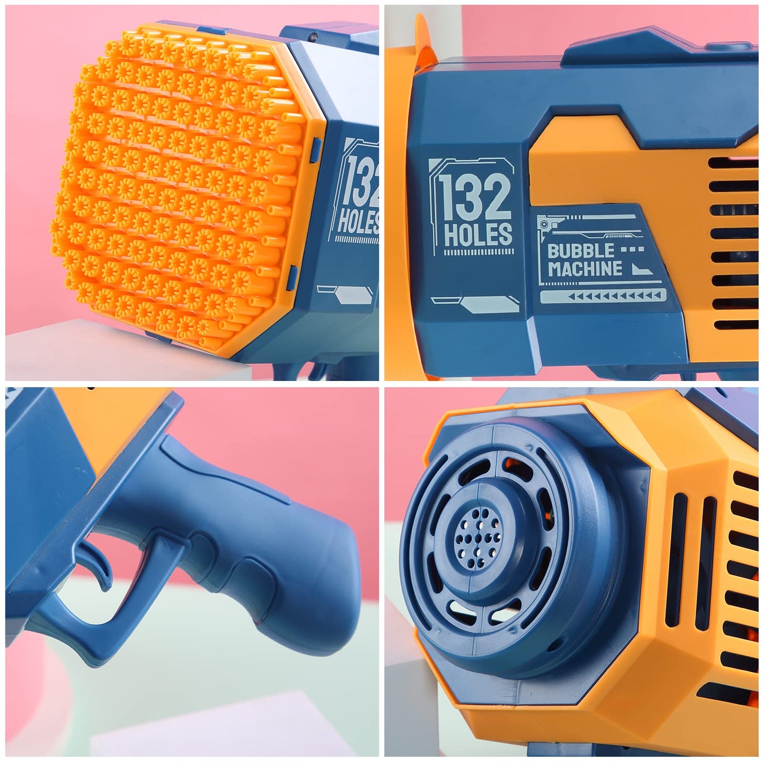 132 holes super large bazooka bubble; Soft lighting, colorful bubbles; Leak-proof device, safe and easy to clean; Can be used as a summer fan to bring coolness.