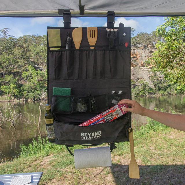 Beyond the Black Stumps camping kitchen organizer is a well thought out design that allows you to neatly organize your utensils, spices and camp cooking essentials like aluminium foil, paper towels and cooking spray in one convenient place. The camp kitchen organizer can hang from a tree, awning, rooftop carrier or your car window allowing you to free up space on your camp table and keep your camp cooking area clean and organized. With all the cooking utensils you will need to prepare a delicious camp meal included, your camping kitchen organizer allows you to keep a separate set of utensils for camping ready to go. INCLUSIONS: Heavy Duty Stainless Steel BBQ spatula Large Stainless steel and silicon tongs that will not melt at high heat 12 inch utility knife with sharpening sheath Eco-friendly Bamboo Spoon set of 3 that will not scratch your pots and pans Bottle & wine opener multitool 2x reusable refill pouches with reusable double zip lock bottoms Spice jar with 4 chambers to store salt, pepper and your two other favourite cooking spices. Cutting Board Scrubber Dish Towel Paper towel or dish towel hanger Beverage holder 2x side hooks for utensils, keys or whatever else you want to hang in a convenient spot. Corner eyelets to fasten to camping ridge poles Buckles to hang from camping ridge poles, RV awning, trees, rooftop carrier or from your car window. 8x sleeve pockets for organizing cooking utensils 4x mesh pockets to store cleaning items or cooking spices Large lower storage pocket with zip closure to store aluminium foil, glad wrap, larger cooking utensils, or whatever else you use frequently and don’t want to dig out of your chuck box! Large zippered sleeve pocket at the back to store cutting board Another large handy sleeve pocket at the back Folds in half for convenient storage Padded carry handle when closed *Organizer does not included utensils