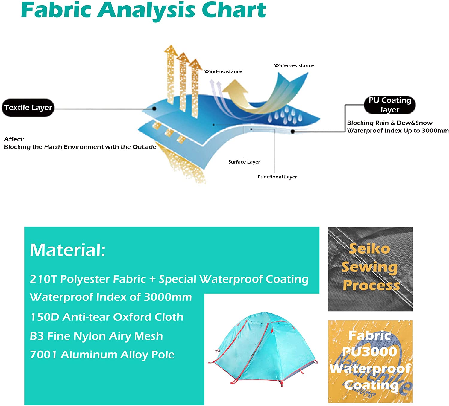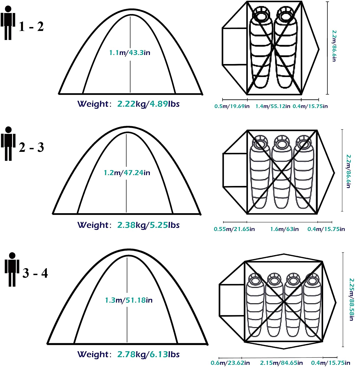- AVAILABLE SIZE -- Double Layer Backpacking Tent is suitable for 2 to 4 people (2P tent for 1-2; 3P tent for 2-3; 4P tent for 3-4) use in 3 seasons for Camping, Hiking, Climbing, Self-driving Tour, Fishing and other outdoor activities
