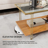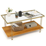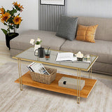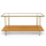 Coffee Table Rectangle Glass Top Wood Bottom Storage Shelf Gold Steel
