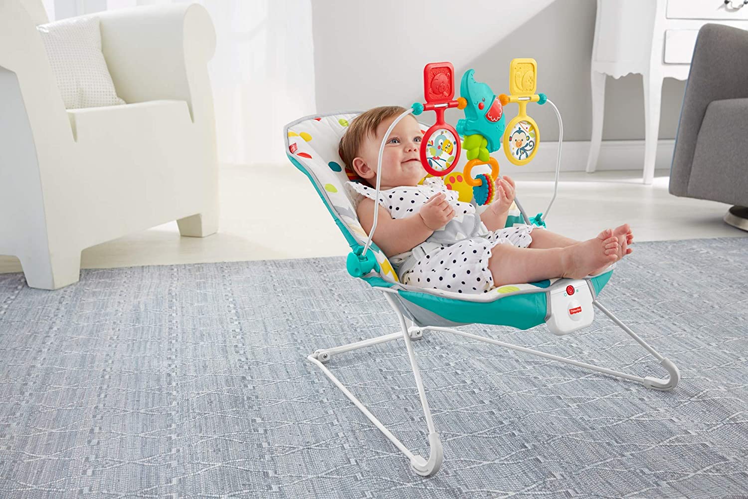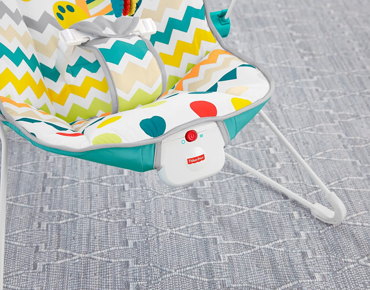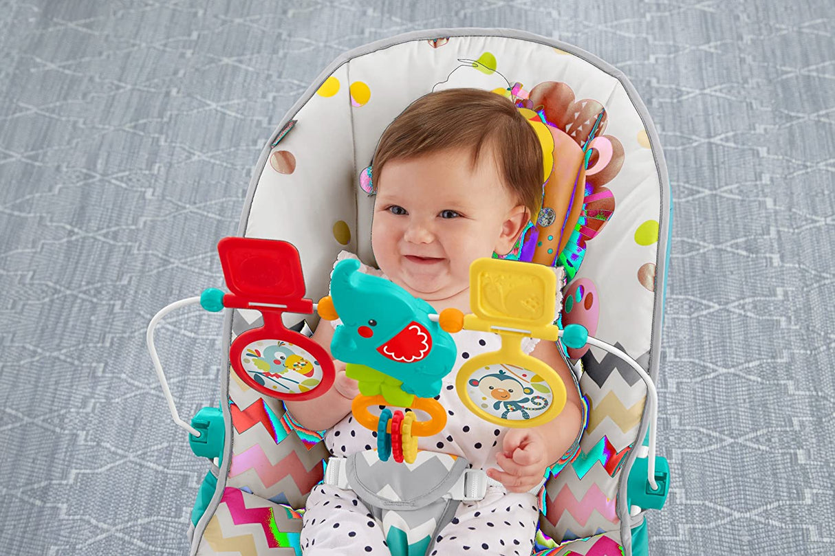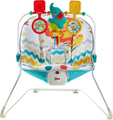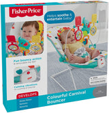 Your baby's natural movements set the Fisher-Price Colorful Carnival Bouncer in motion, gently bouncing to help comfort and soothe. The optional calming vibrations and soft, cozy seat help the baby feel safe and secure. And when the baby's in the mood to play, the overhead toy bar offers tons of fun!