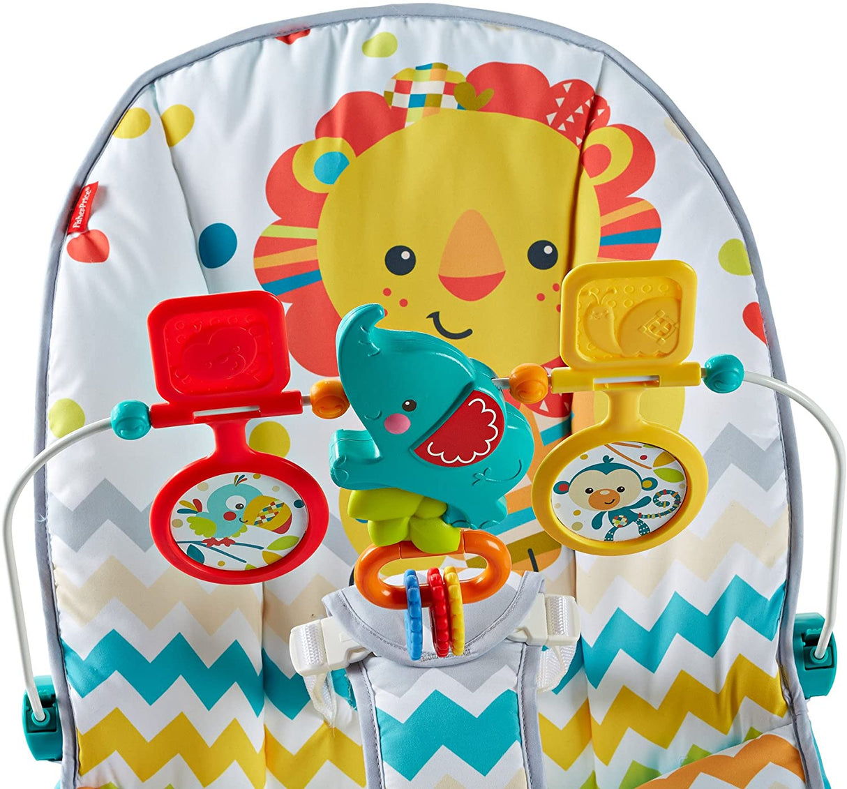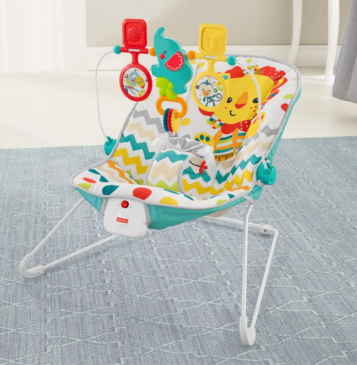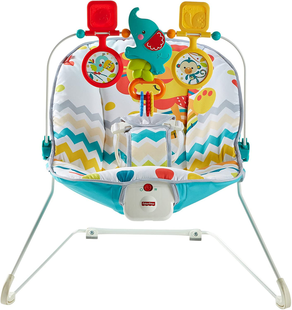 Your baby's natural movements set the Fisher-Price Colorful Carnival Bouncer in motion, gently bouncing to help comfort and soothe. The optional calming vibrations and soft, cozy seat help the baby feel safe and secure. And when the baby's in the mood to play, the overhead toy bar offers tons of fun!