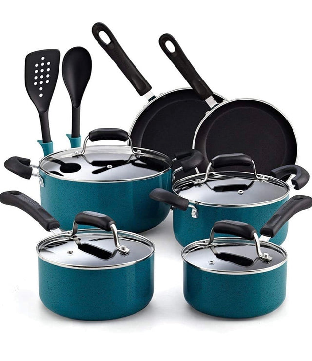 The Cook N Home 12Piece nonstick stay cool handle cookware set, Turquoise includes: 1. 5 and 2 quart Saucepans with lids, 3 quart casserole pan with lid, 5 quart Dutch oven/stockpot with lid, 8 and 9. 5-Inch fry pans, and a nylon spatula and spoon. Thick gauge aluminum provides quick/even heat conduction and prevents hot spots. Nonstick makes food release/cleaning easy and allows for healthy cooking. Tempered glass lids with steam vent for viewing food while cooking and keeps heat and moisture in. Lids fit on fry pans. Soft touch handles stay cool/comfortable and are wide with a hole for hanging. Utensils with guard are durable for mixing, moving, and transferring foods. Works on: gas, electric, glass, halogen, ceramic, etc. Not induction compatible and not oven safe. Dishwasher safe.