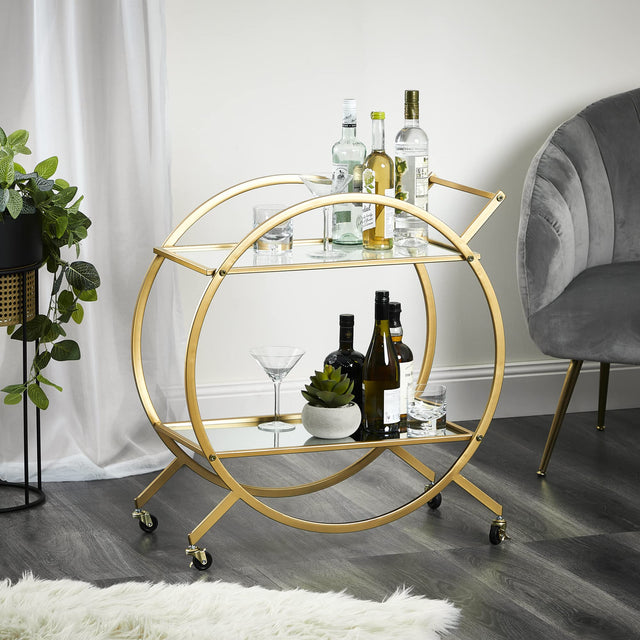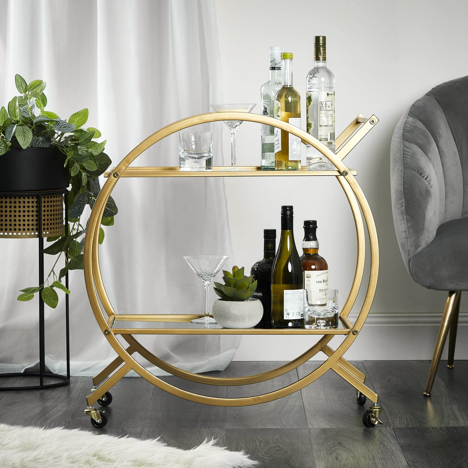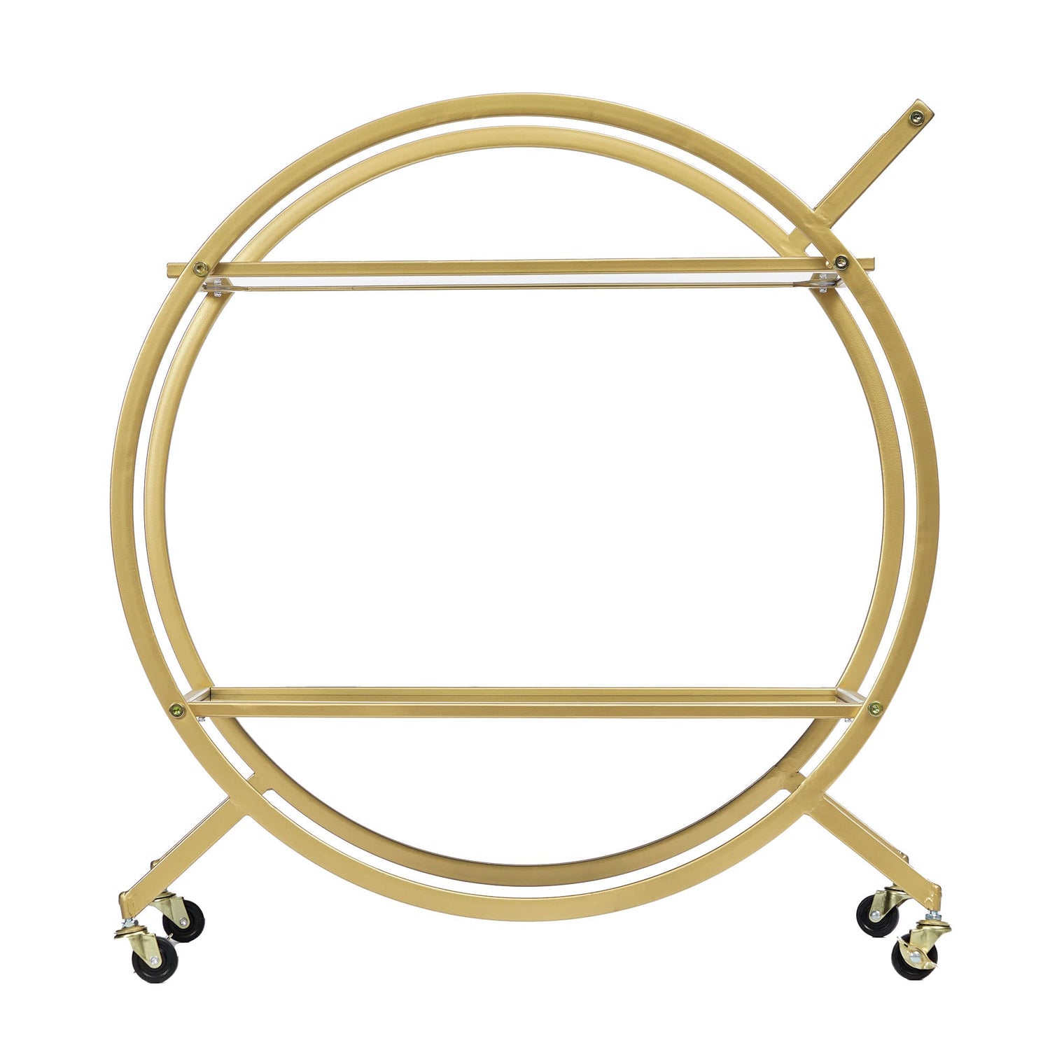 Entertaining in style just got a whole lot easier. The Remy Bar Cart by Cooper & Co. is a versatile piece to complement your dining, kitchen or entertaining area. The two glass shelves can hold up to six wine glasses plus a couple of bottles of wine. And you'll have extra storage space to set drinks and snacks down on. The Remy transforms your space into a hot spot for wine, spirits, and more. Features modern round design creates a charming and classic look. The Remy can also serve as a coffee cart, dining storage or as an end table. Two-tier utility cart provides large storage space while saving you floor space. Sturdy metal frame while the mirror top adds a sleek look. Four-wheel casters and a raised handle let you manoeuvre the rolling cart effortlessly. Ideal for living room, bedroom, kitchen, dining room. Easy to install and easy-to-follow instructions and hardware included.
