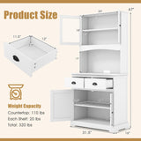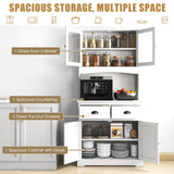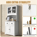 - Spacious Storage & Multiple Space: This kitchen pantry storage cabinet consists of 1 glass-door cabinet, 1 spacious countertop, 2 deep pull-out drawers, and 1 spacious cabinet with doors, providing storage to place some different daily necessities. An upper storage cabinet with tempered glass doors adds decorative aesthetics to your room for better display and long-lasting use.