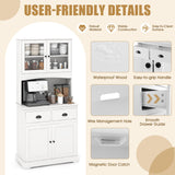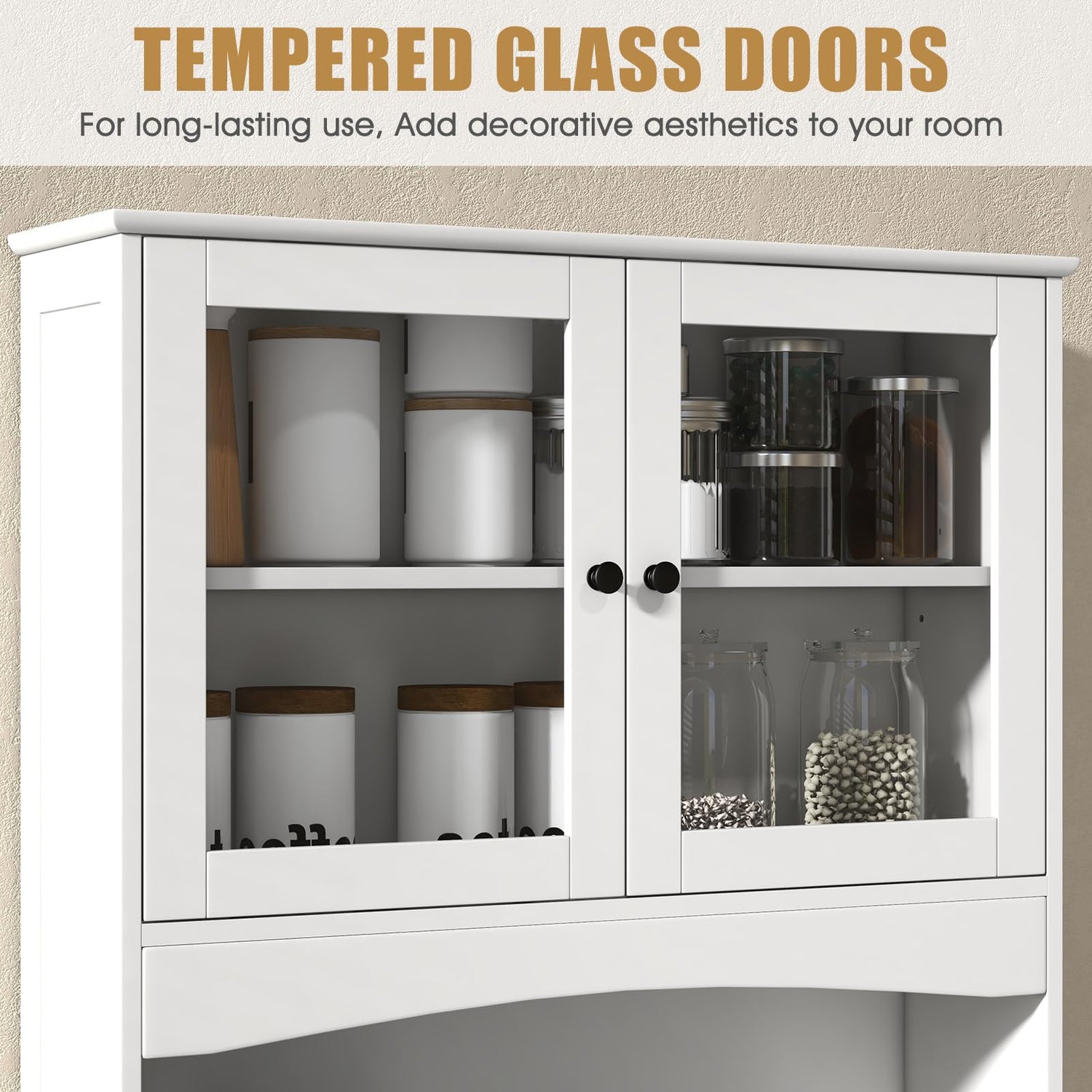 Tall Storage Cabinet, Freestanding Kitchen Pantry w/Microwave Stand & 2 Drawers, Adjustable Shelves, Tempered Glass Doors, Cable Hole for Living Room, Dining Room (White)