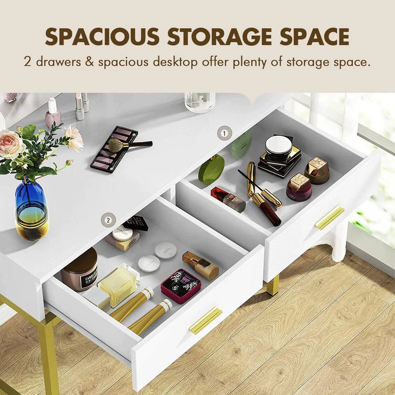 - Ultra-large Vanity Storage Space: Containing two drawers, the vanity table can organize and store all your cosmetics and makeup tools. Say goodbye to messy storage.