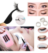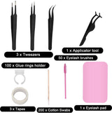 - Eyelash Extension Kit: includes 50 x mascara wands, 3 x stainless steel eyelash tweezers, 1 x flase eyelash applicator tweezer, 1 x silicone eyelash pad, 200 x cotton swabs with wood sticks, 100 x glue ring holders, 3 x eyelash tapes