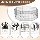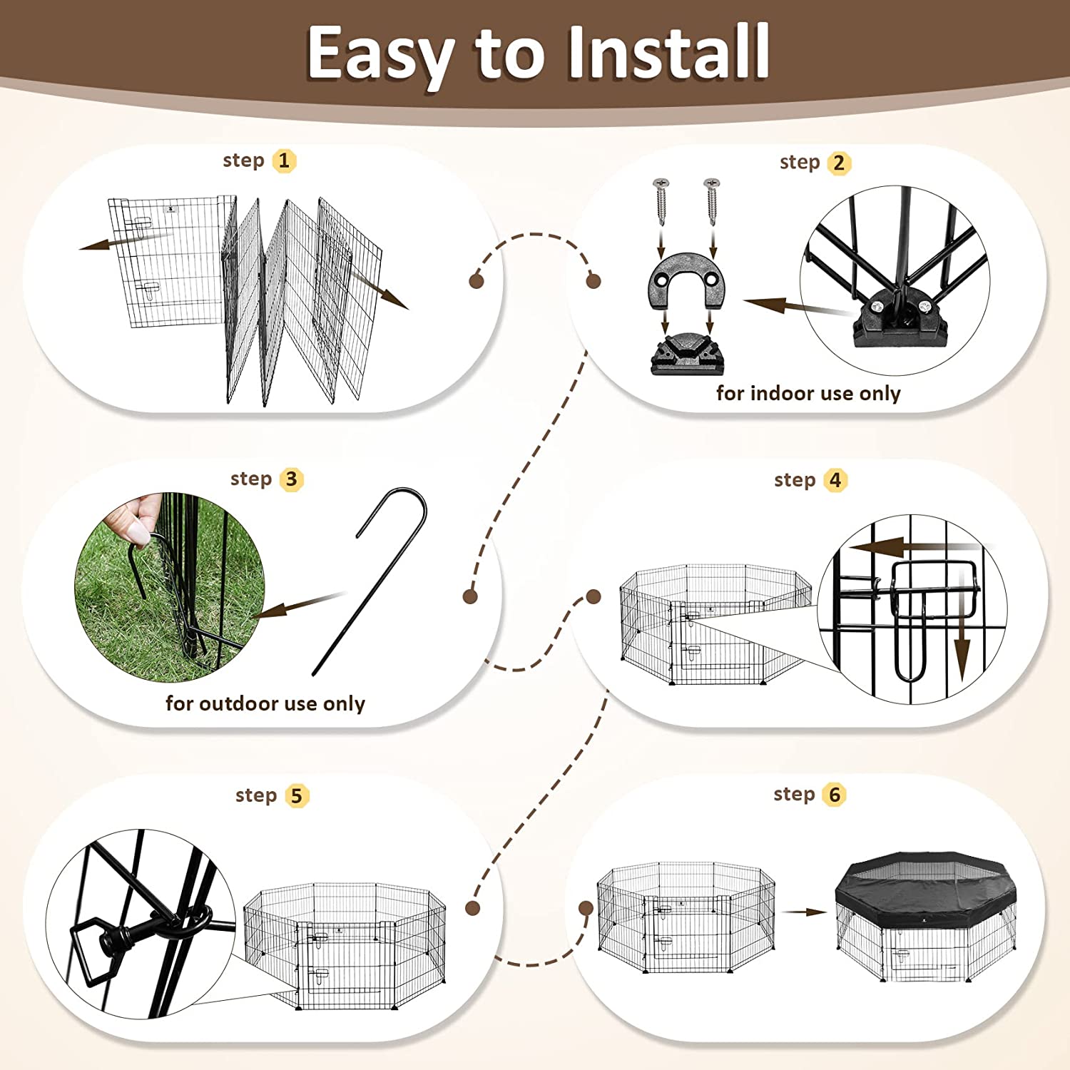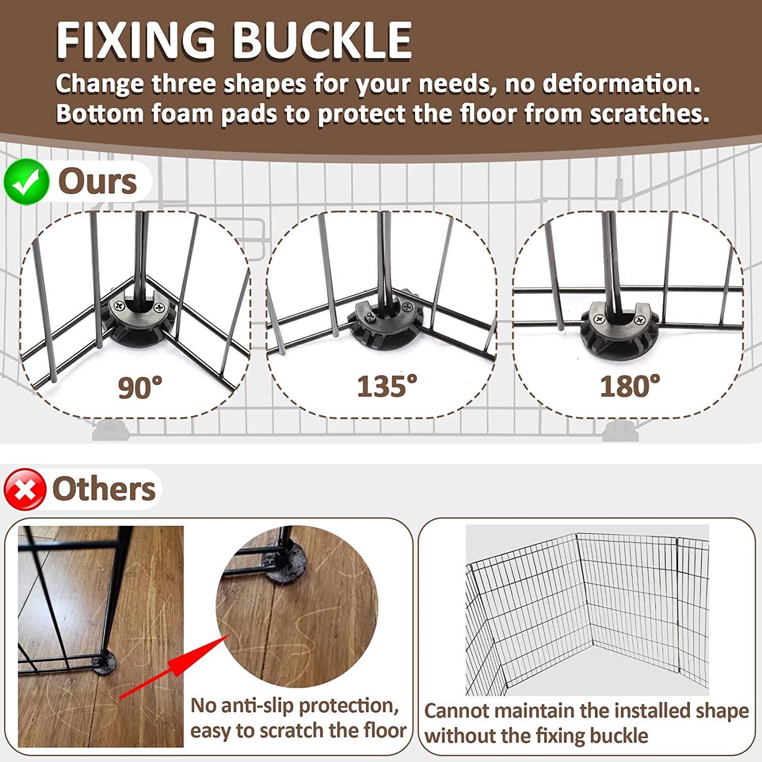 - Easy to Install and Stable: The playpen has eight panels made of high quality solid wire, each panel size is: 76CM x 76CM, easy to assemble and has many ways to assemble. The fence has multi-angle fixing buckles (patented product ), to strengthen the stability of the fence, not easy to collapse and hurt pets.