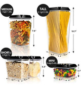 - STORAGE - Different size canisters allow for a variety of storage option. Great for storing dry goods and kitchen staples including flour, sugar, pasta, oats, beans, nuts, cereals, snacks, pet food and baking ingredients. The large container can easily hold tall spaghetti noodles