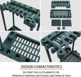 Front-loading tool slots eliminate the problem of removing and placing long-handle tools.