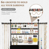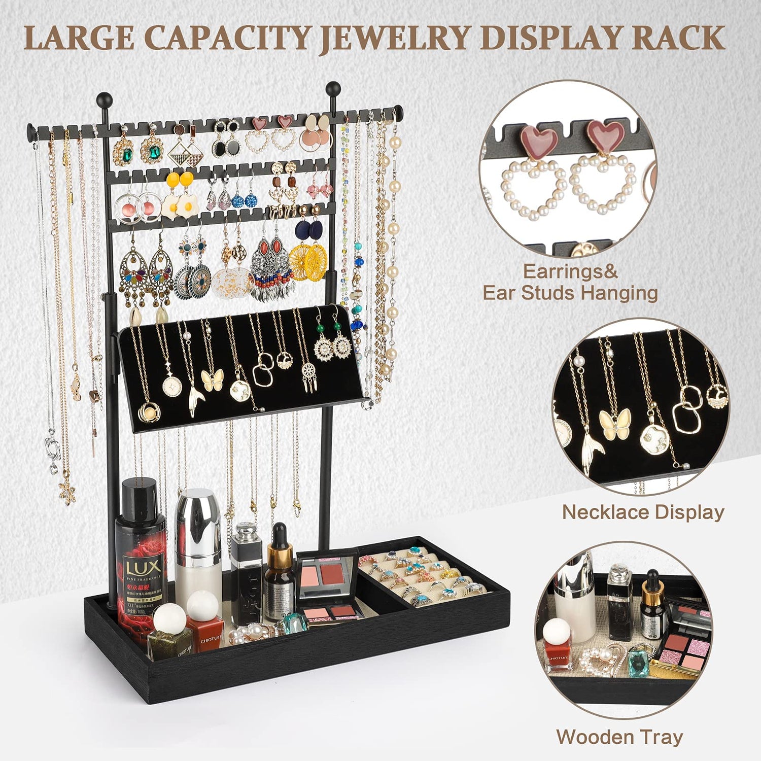 - Ample Storage: Jewellery stand equipped with 3-tier earring rack with 60 grooves, 1 unique necklace display stand and 1 large natural tray with 1 ring stand, the storage capacity is large enough to organize your necklaces, earrings, rings, bracelets, watches, hairpins and other small accessories.