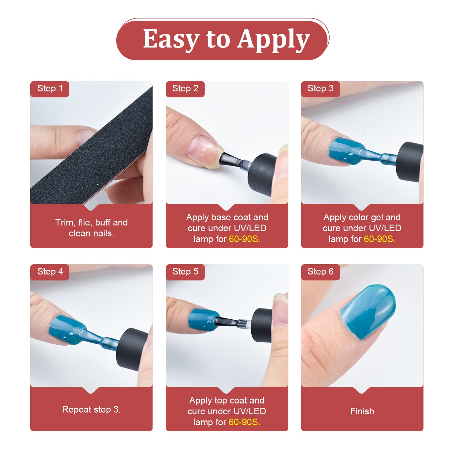 - Warm Notice : Nail gel polish has different color differences in different light sources, displays and coatings. The color card shown in the picture is coated with two layers of color gel. When you encounter any problems, please feel free to contact us.