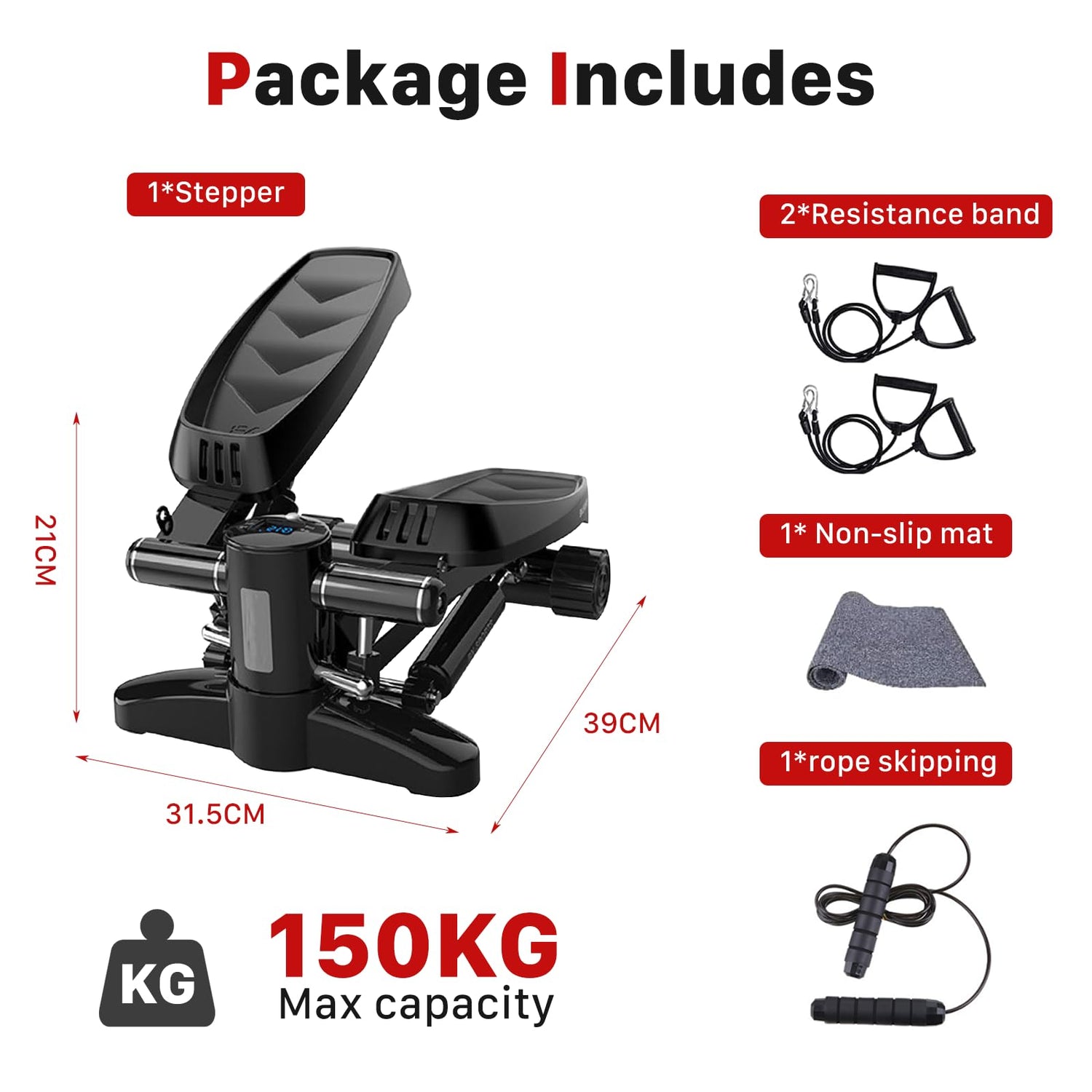 - Effective Full-Body Workout: Our stepper is designed for comprehensive muscle engagement and comes equipped with removable resistance bands and a floor-protecting mat. The stepper targets areas such as the legs, buttocks, and abdomen, while the resistance bands simultaneously work your arms, chest, back, and shoulders. The included mat provides floor protection during your workouts, combining safety with an effective full-body workout.
