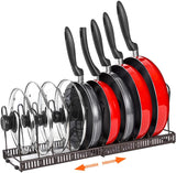 Expandable Pans Organizer Rack, 10 Adjustable Compartments, Cookware Holder for Pantry or Cabinet, Brown (Pan Rack) is backordered and will ship as soon as it is back in stock.