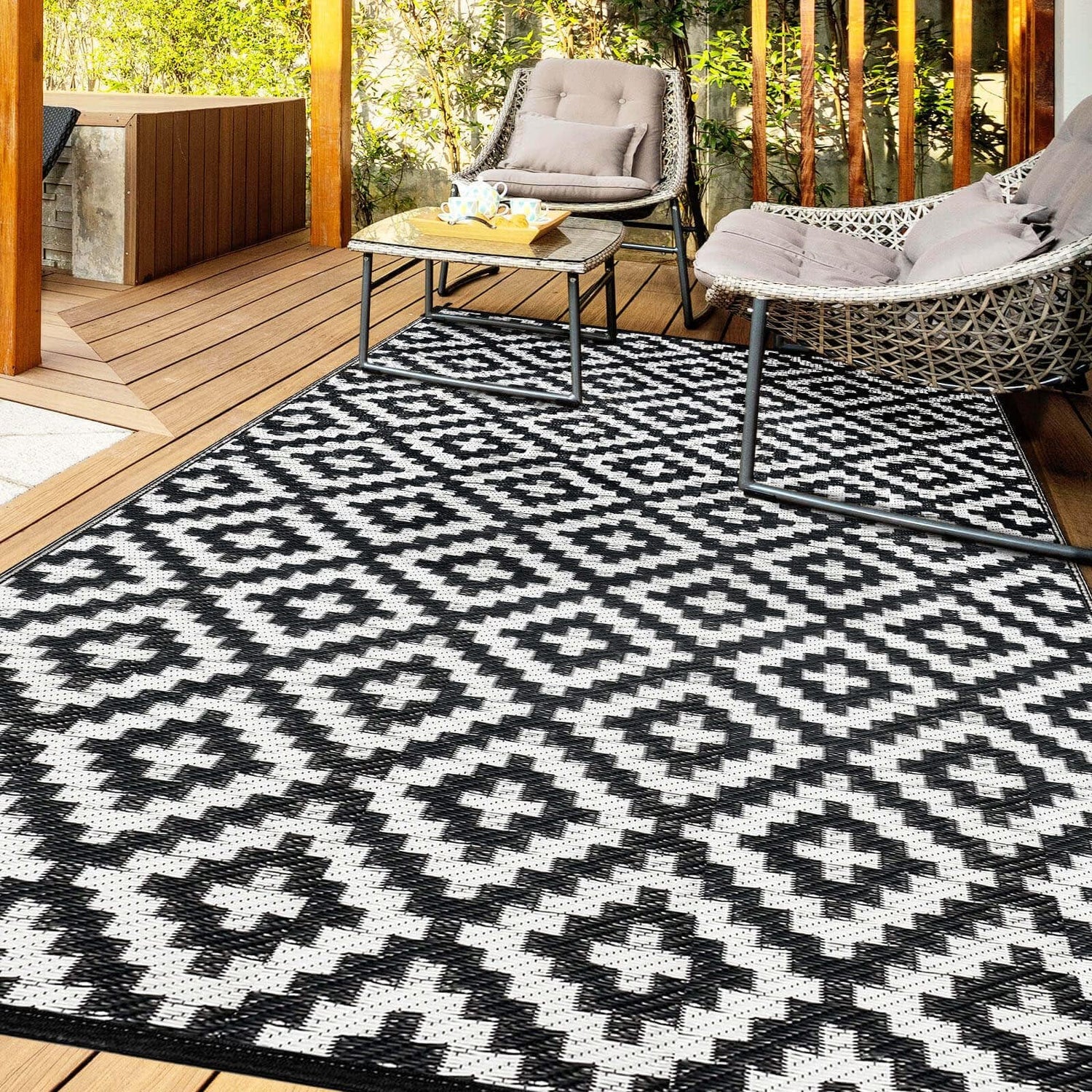 - REVERSIBLE MATS: With timeless design, this plastic patio rug is elegant as it is functional, use on your patio with outdoor furniture and accessories to show off your personal style.