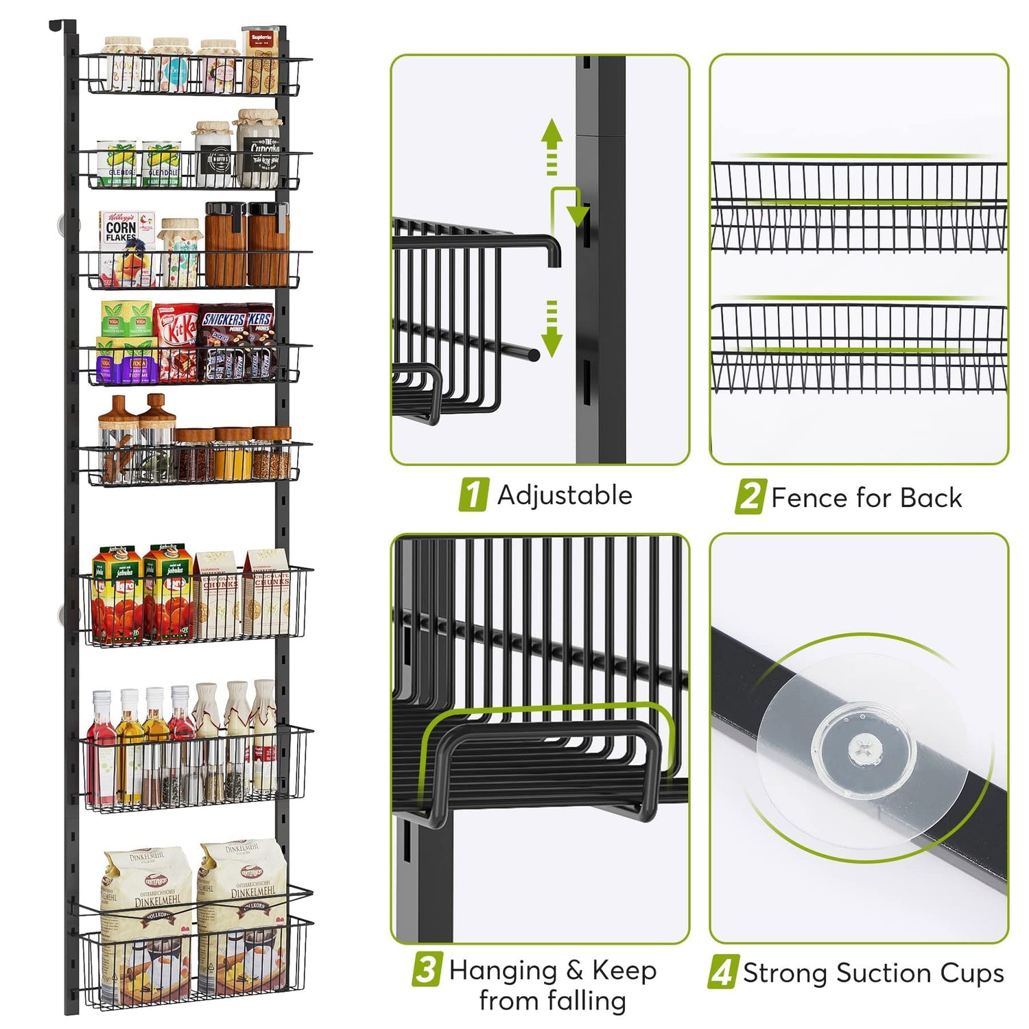 - Adjustable Height Baskets & Detachable Frames: Considering the height of doors and home stuff in different sizes, we design the pantry door organizers adjustable and detachable, so that you can use them anywhere you like, and no need to worry about the door's height or stuff is big or small.