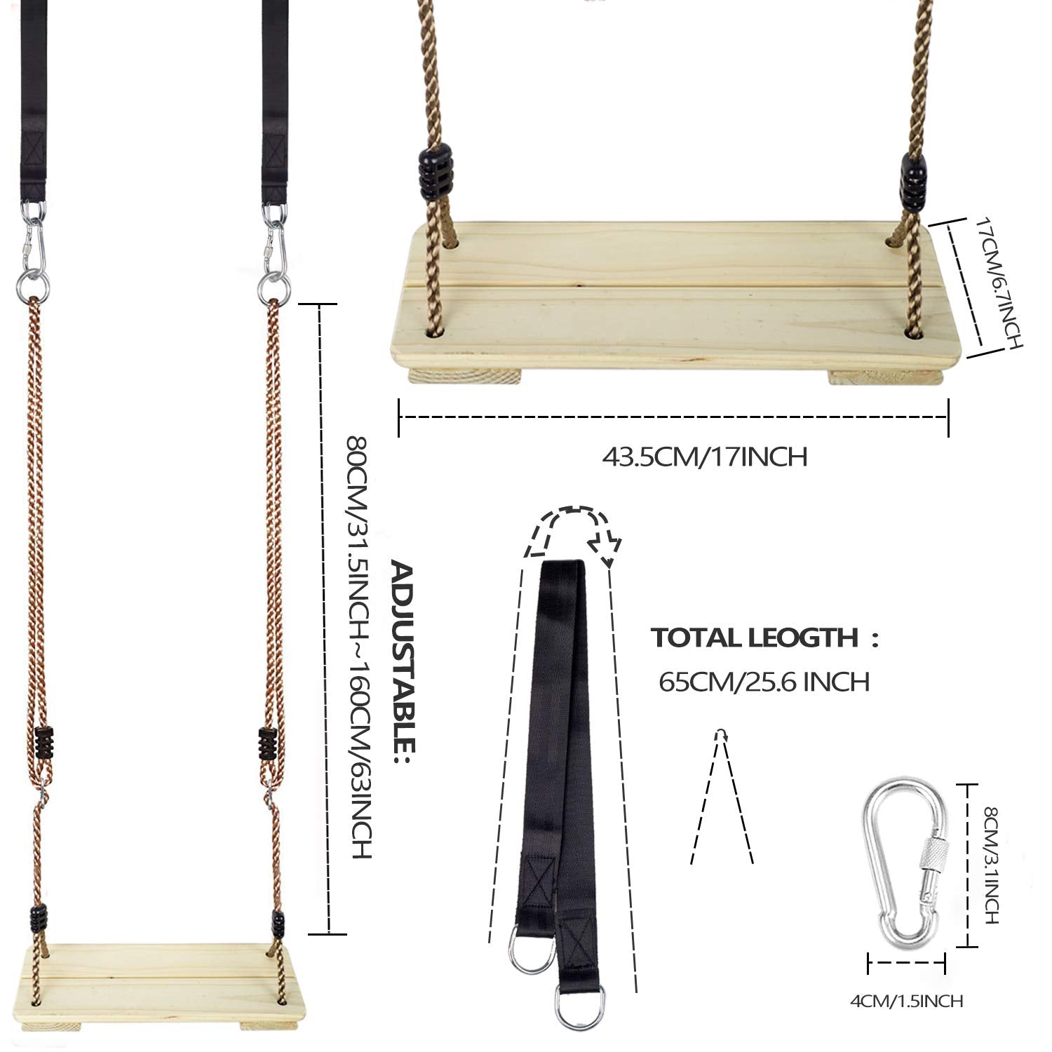 - Swing Seat for Kids Adults: 17.3*7.1 inch(L*W); Adjustable Height: 31.5'' to 63''; Weight limit up to 300 lbs. It's a nice wooden swing, easy to hang from oak tree and just adjusted one side of the swing so it sits even. So easy, took probably 5 minutes, stained the wood swing to any color you like, the bare wood was perfect for making a color change with paint and a seal coat for protection.