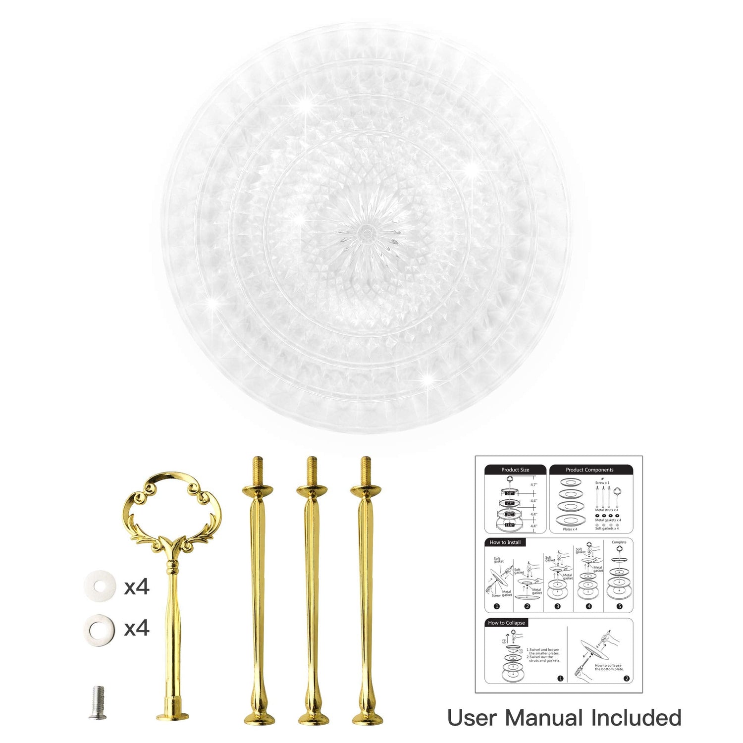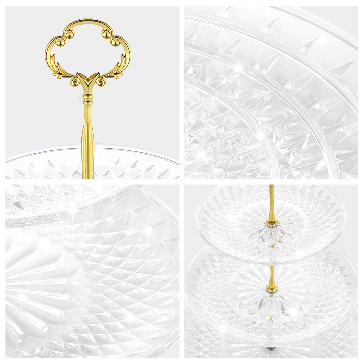 - ELEGANT AND CLASSIC. Featured with crystal clear rhombus detailed plates and elegant gold metal struts, this elegant and classic style cupcake stand can be decorated easily with any beautiful ornaments like flowers, decorative balls, dolls, leaves, and other desserts cookies, candies, snacks, donuts, pies, bakery, etc., it is a perfect centerpiece for any party themes