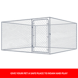 Our versatile dog kennel is ideal for your dogs to play, exercise, train or just keeping them safe. It will be the perfect play paradise for your furry friends! The playpen is made of heavy-duty galvanised steel, making it durable and suitable for outdoor use. The chain-link mesh sidewalls help prevent mischief and unexpected accidents while enabling air ventilation. The dog playpen is equipped with a hinged door and lockable system for extra security and safety for your dogs. The dog kennel is easy to assemble.