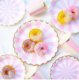 - This set of gold foil and pink disposable paper plates and cups are made of thick and high quality paper. This beautiful dinnerwares will definitely add elegance to your party and turn your party into a remarkable experience.
