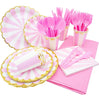 - This Ready-to-Party Set of 141pc elegant gold foil and pink dinnerware includes 20 dinner plates, 20 dessert plates, 20 paper cups and 20 Napkins, 20 knifes, 20 forks, 20 spoons and 1 table cloth.