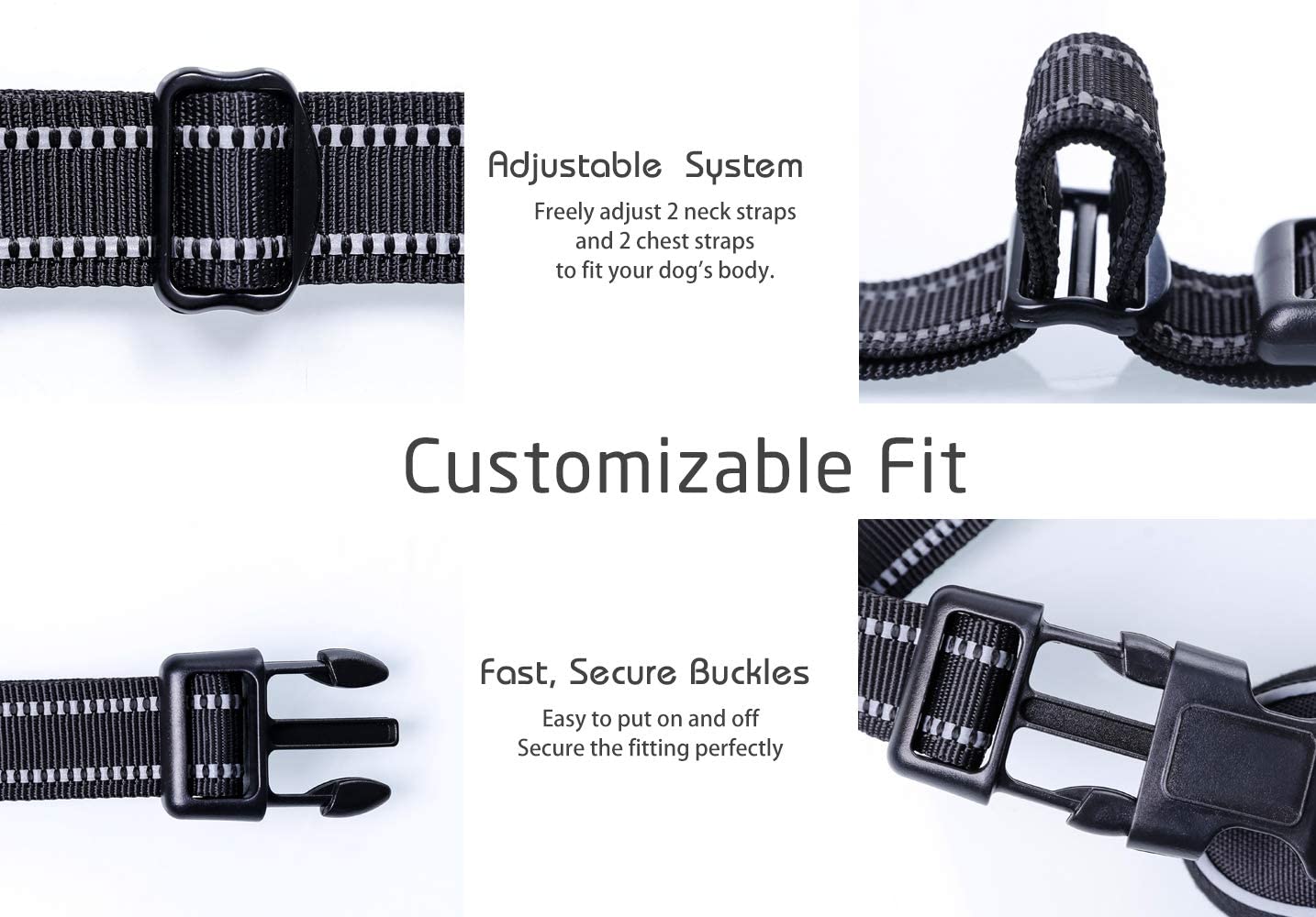 - Fully Adjustable: This adjustable harness features 4 easy Adjusting Straps around the body. You can use its 2 neck straps and 2 chest straps to create a Perfect Fit for your dog with some room of growth. No worries about slipping out or choking