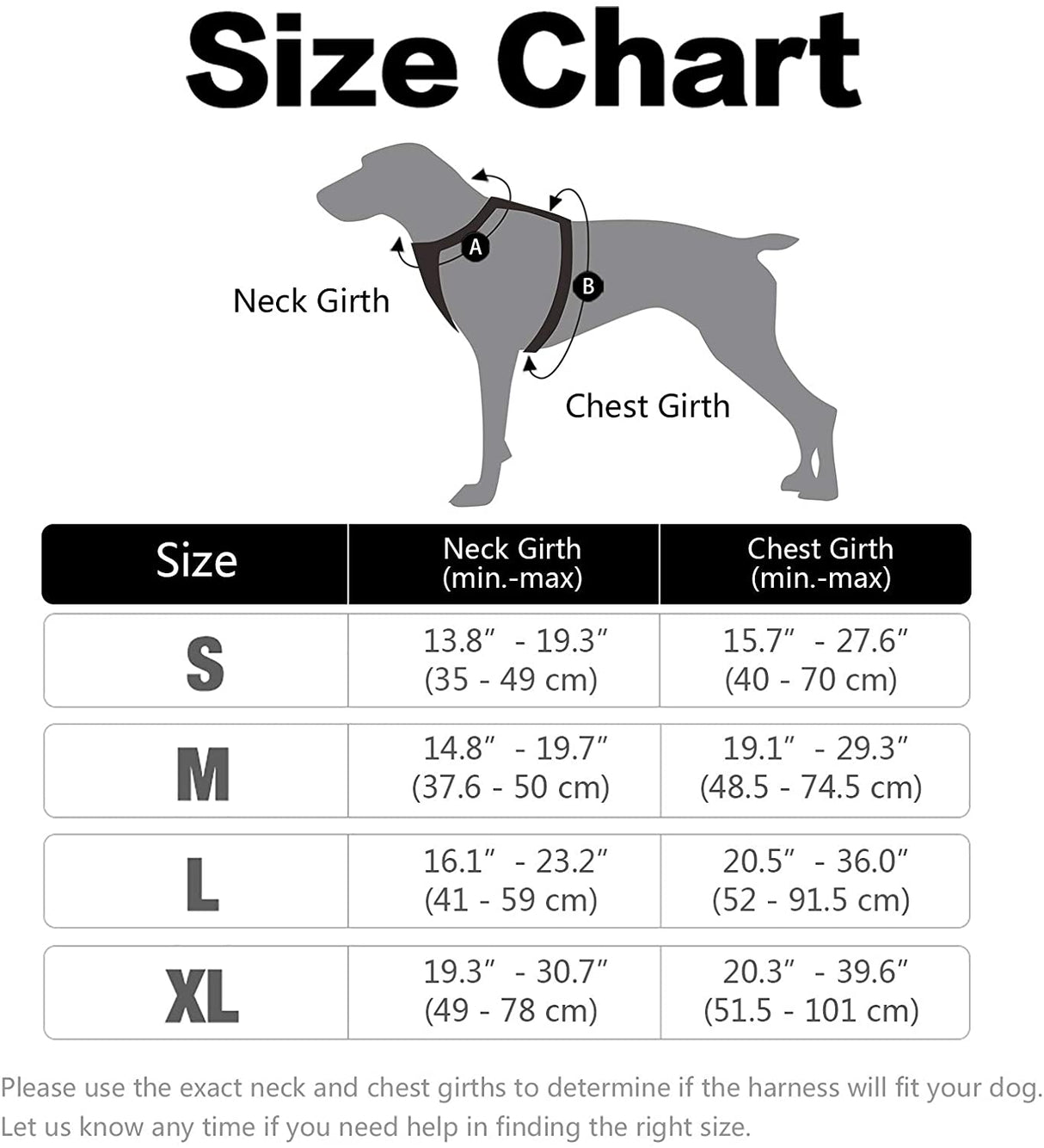 - Large Dog Harness: Measuring Neck Girth: 16.1" - 23.2", Chest Girth: 20.5" - 36" ā . Please refer to the size chart before purchasing for your lovely dog. Recommended Breeds: Medium to Large Dogs, such as Golden Retriever, Huskie, Labrador, Alaska, German Shepherd, Akita, etc. Let your pup to be the lead-dog of the community with this Smoky Grey Harness!