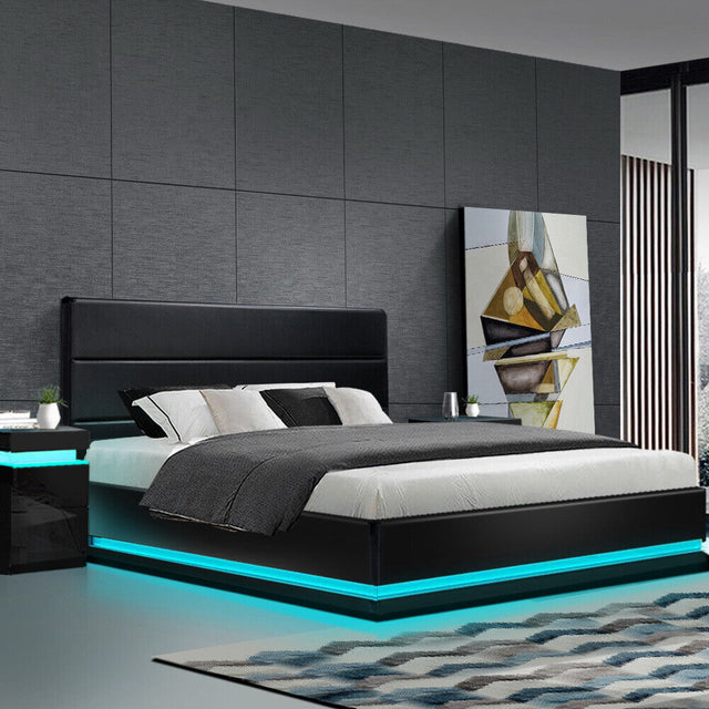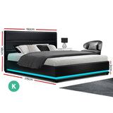 RGB LED Bed Frame King Size Gas Lift Base Storage Black Leather LUMI