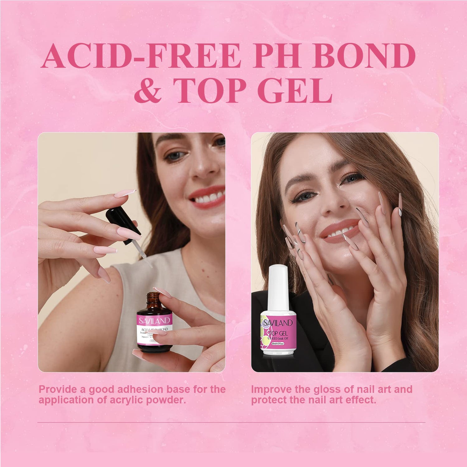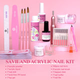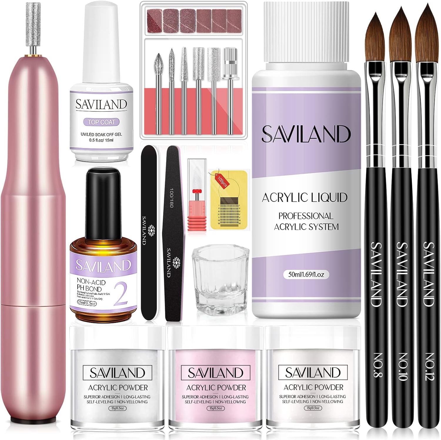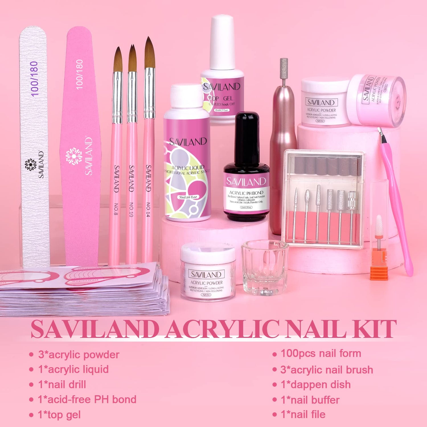 - Nail Kit Set Professional Acrylic With Everything: Saviland acrylic nail kit comes with 3pcs 15g clear/white/pink acrylic powder and liquid set, electric nail drill, acid-free PH bond and top gel, and nail form, acrylic nail brush and nail file, dappen dish and others essential acrylic system tools for acrylic application. Suitable for beginner who want extension nail and create 3D nail art.
