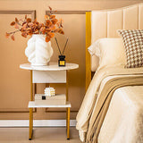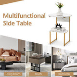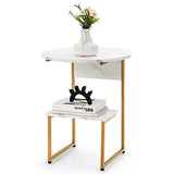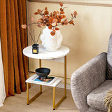 With proper dimensions of 50cm L x 34cm W x 61cm H, the compact side table is suitable for small spaces, working well in living room, bedroom and study. Being small in size, the end table is still functional and useful because the 2-tier design provides ample space for storage and display. Thus, the table can serve as a coffee table, a nightstand or couch side table to bring convenience when you are enjoying your leisure time on the sofa or bed. What’s more, the modern end table is sturdy and durable thanks to the stove varnishing G-shaped steel frame. And the adjustable foot pads can keep the accent table stable. In addition, the stylish appearance with faux marble and gold frame makes the end table match different furnishing styles.