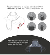 - COUCH ARM COMPATIBILITY: CouchCoaster is designed to wrap over any armrest measuring at least 14cm / 5.5” wide with flat to gently sloping sides. Skinny or narrow-armed couches should be avoided. Alternatively, you can lay CouchCoaster horizontally, tuck it between seat cushions and pillows, or drape it over the back-rest on any upholstery.