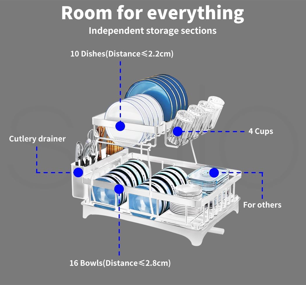 - Two-Tier Efficiency- Maximize your kitchen space with a 2-tier drying rack.It is for dish holders, cutlery and utensils storage.