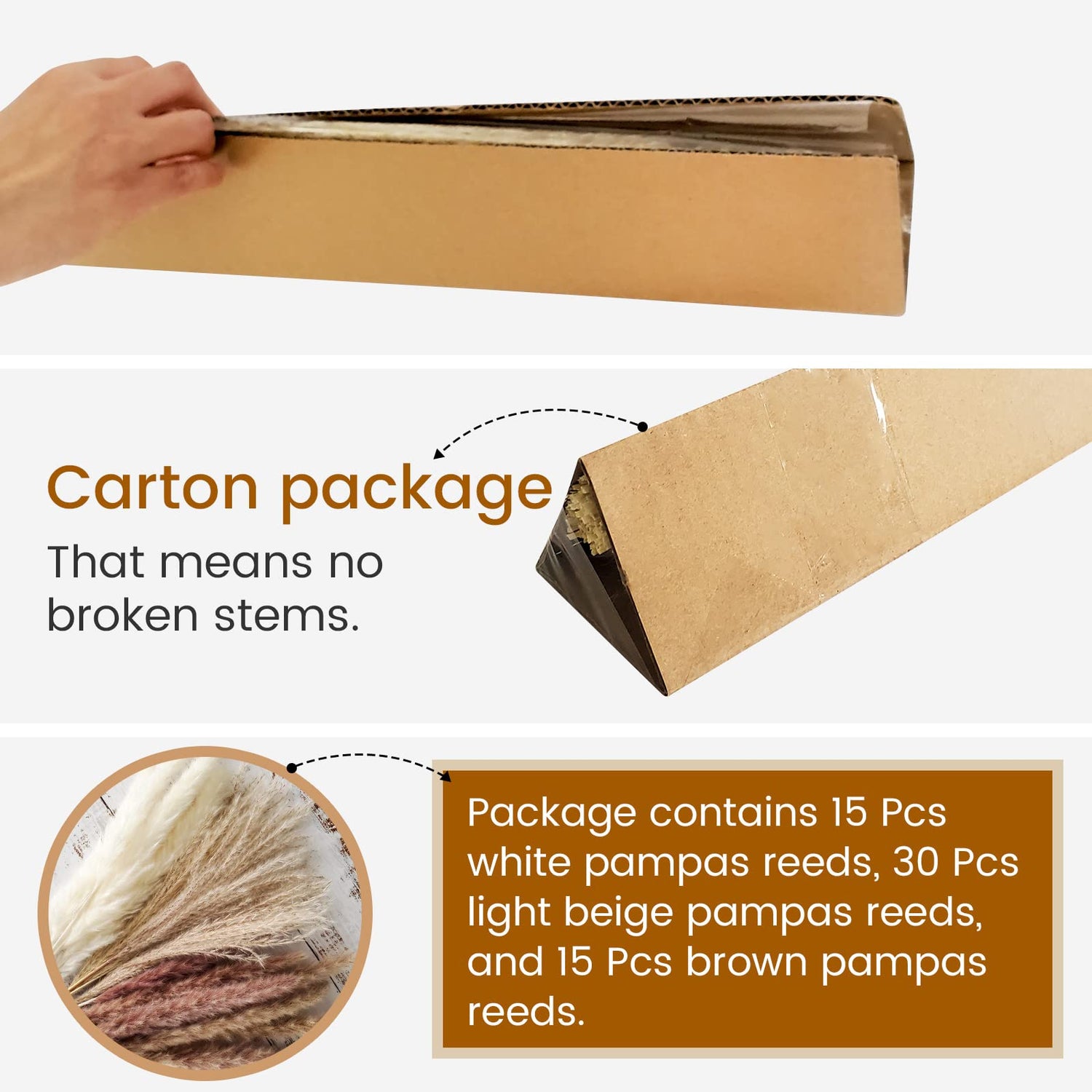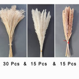 - Includes: A selection of 60 Pcs pampas grass, including 15 Pcs white pampas reeds, 30 Pcs pampas reeds, and 15 Pcs brown pampas reeds.