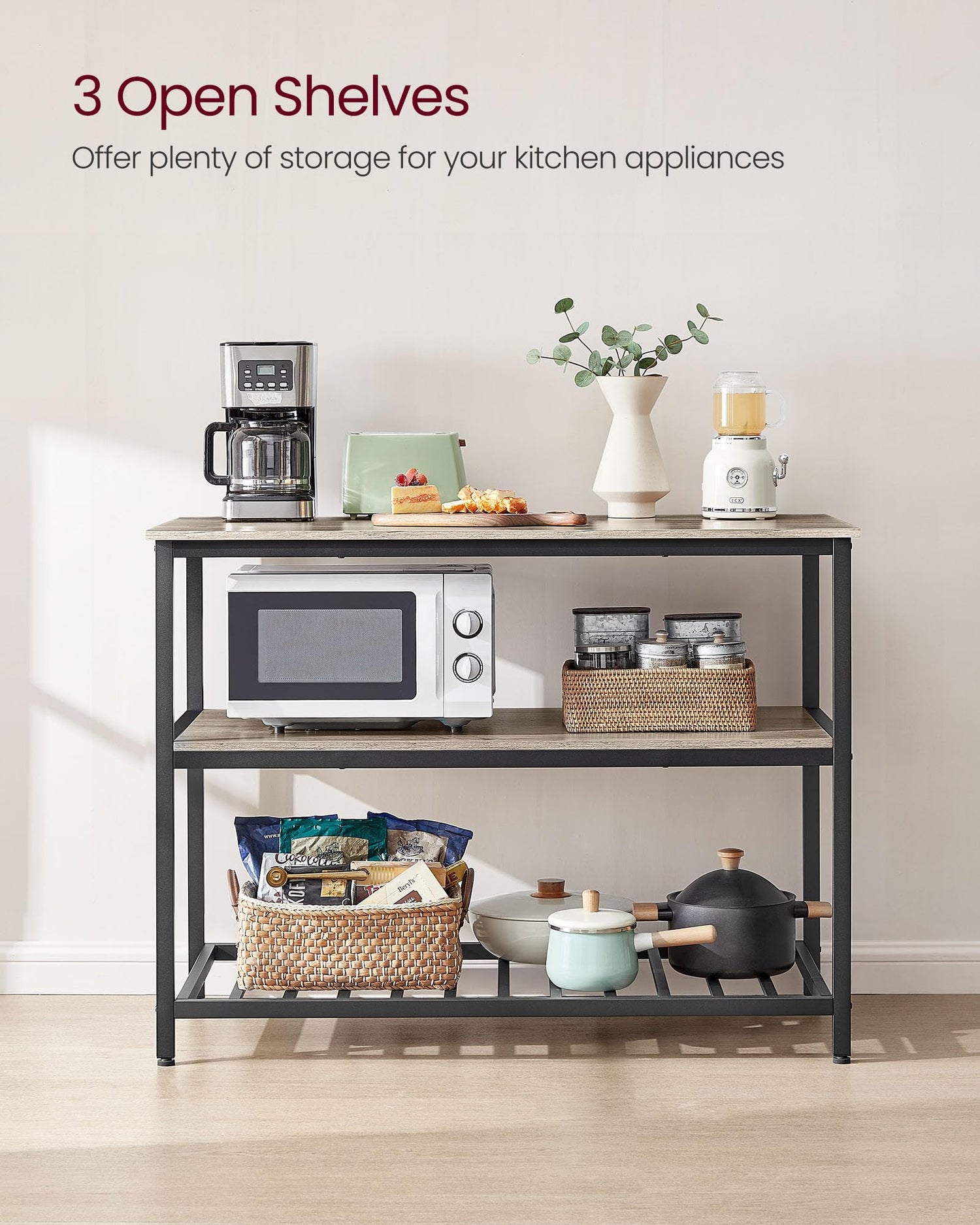 • 3-Tier Storage: Place a flower vase or a tea set on the top, kitchen appliances on the middle shelf, and storage boxes with bakeware on the lower grid shelf—everything is nicely organized on this 3-tier Island table with easy access