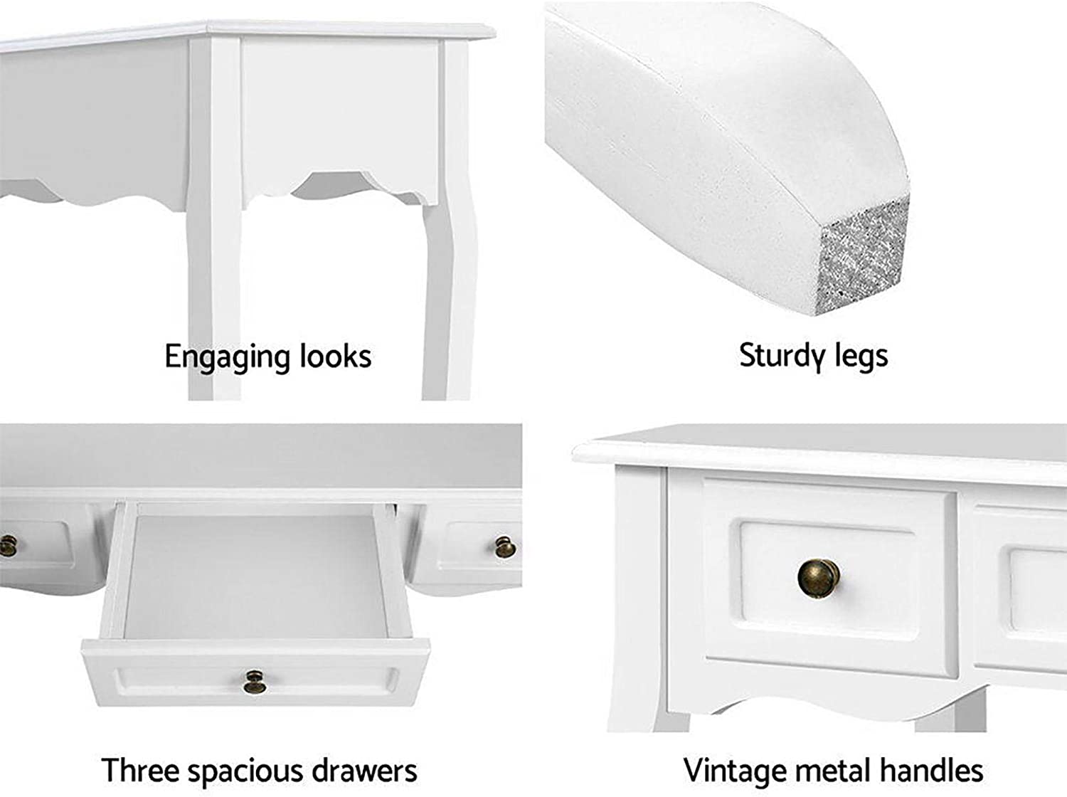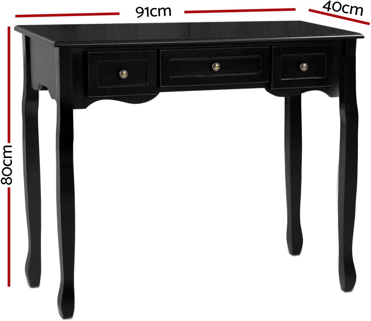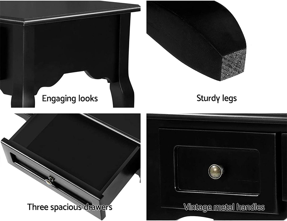 and charm. Made of high-quality MDF board for the tabletop and sturdy paulownia wood for the rest, the console table looks absolutely beautiful with its meticulous craftsmanship and fine lacquered finish. Three generous-sized drawers with exquisite antique-style metal handles provide ample storage space for your essentials and knick-knacks while the wide tabletop lets you display your favourite home décor in resplendent style. Make a grand entrance for your guests or even for yourself with our vintage console table. It will be a gracious welcome indeed.