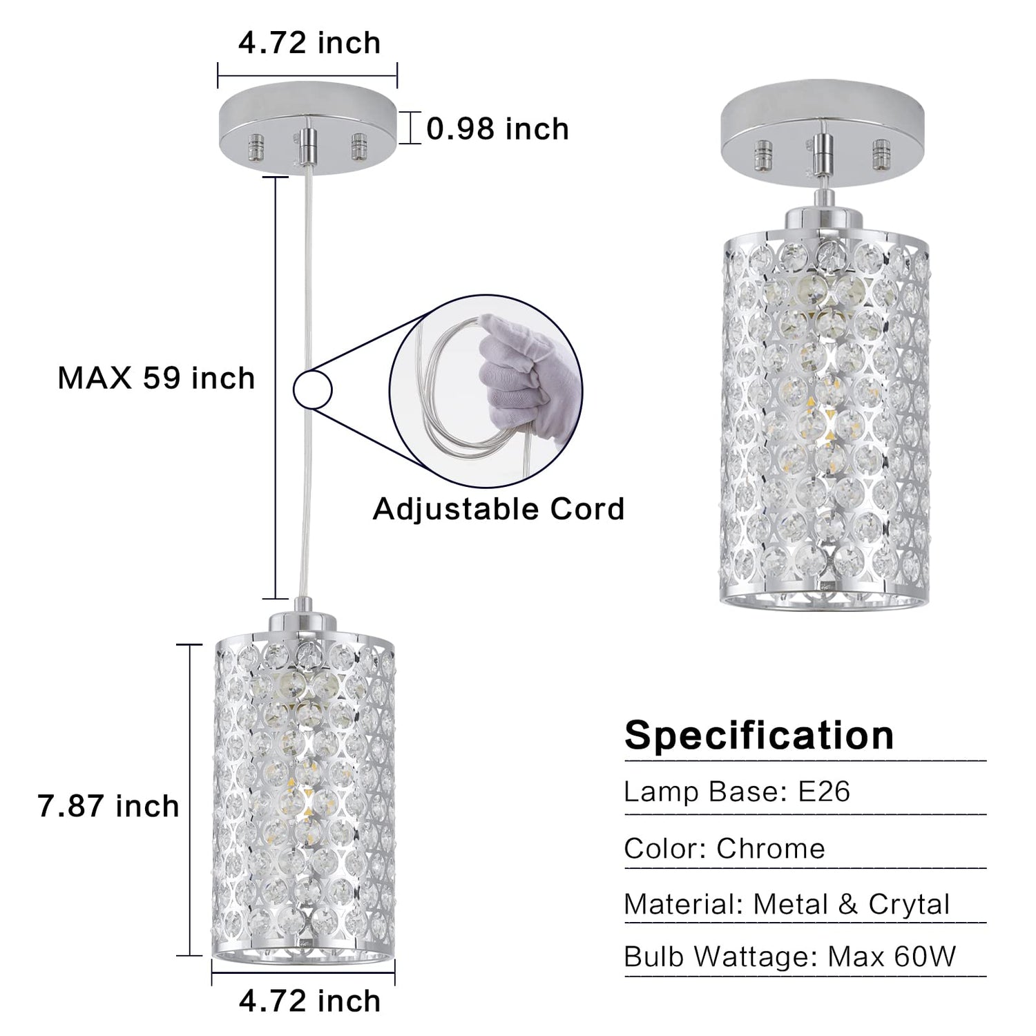 - Adjustable Length: Crystal Shade: 4.72'' D x 7.87'' H, Canopy: 4.72'' D x 0.98'' H, Adjustable Cord: Max 59’’. Thanks to the flexible PVC wire and the adjusting device at the canopy, This crystal light fixture is compatible with high/low, flat/sloped ceilings.